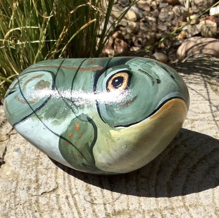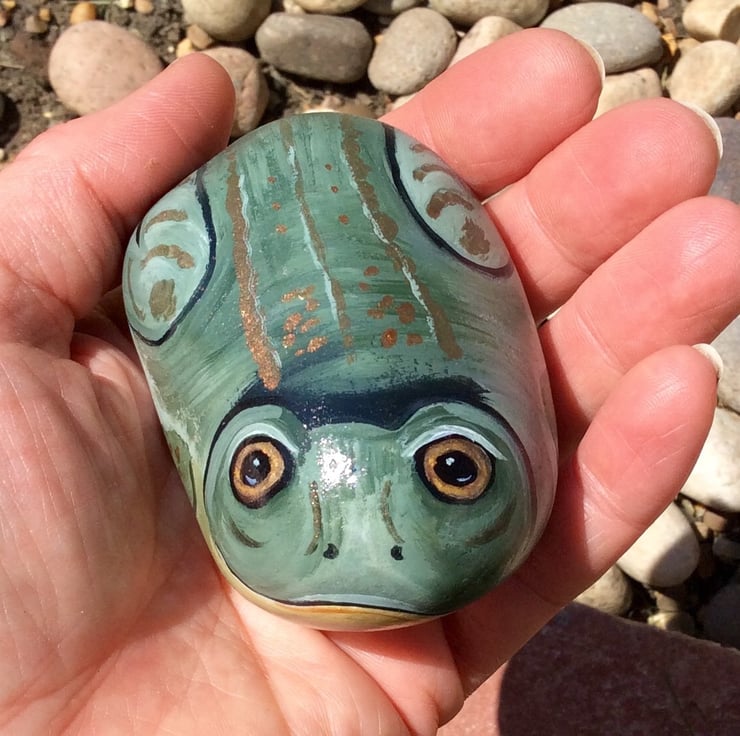 A little frog which has been hand painted using acrylics onto a smooth stone. It has been glazed with a glossy protective glaze suitable for outdoor use if required. It will be sent second class signed for thanks.