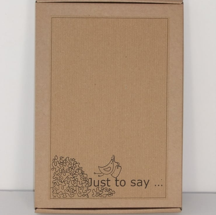 This little messenger carries a ‘Just to say’ tag in its beak (from: https://folksy.com/shops/StephShortSupplies) which provides space for a greeting and a longer message could be added to the back of the card or included in the presentation box.