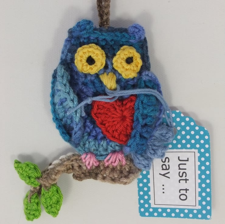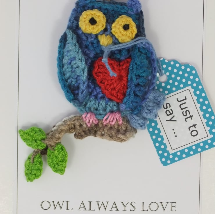 A greeting and gift in one and a great way to send your love to a special someone! The owl and the branch it sits on are crocheted in a colourful, soft bamboo-sourced viscose and wool yarn. The rest, including its loving heart, is 100% cotton and the owl’s body is lined with craft felt.