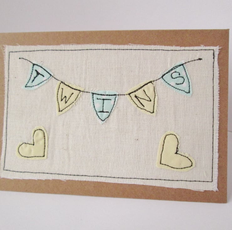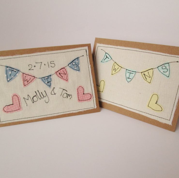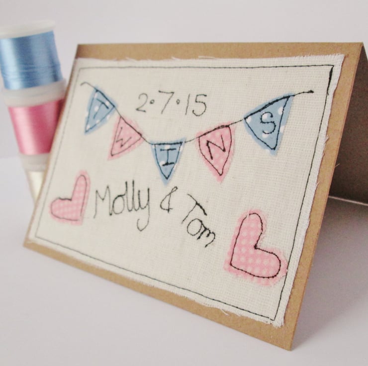 The card is made using appliqué. The girls card comes with two lovely little pink hearts, the boys card features a blue boat and the girl and boy design features blue and pink bunting with pink hearts."Twins" is embroidered on the bunting and the names and date can be added to complete the design. A great keepsake for the new parents!