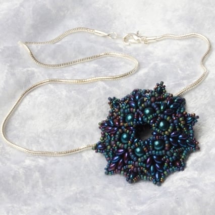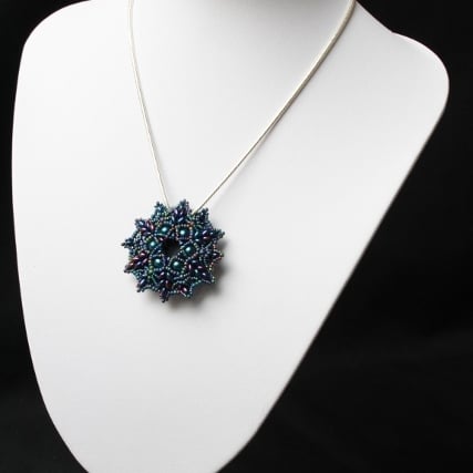 This stunning beadwoven pendant is in shades of dark blue and dark petrol blue. Many of the beads are iridescent having accents of purple, bronze and green. This twelve-pointed hollow-centred pendant is double-sided. This means that if it flips over whilst being worn, it will still look just as pretty. Glass pearly beads (6mm) and iridescent oval Superduo beads are embedded in a network of little seed beads. These seed beads are Miyuki, renowned for their high quality. The pendant is strung on silver-plated snake chain finished with a trigger clasp. This chain is of good quality and drapes well.