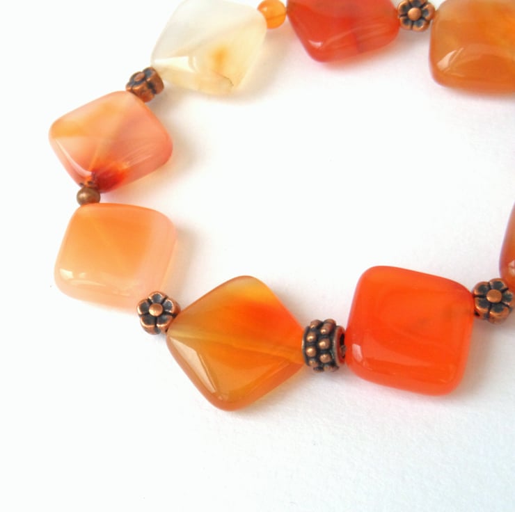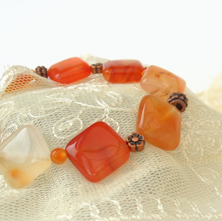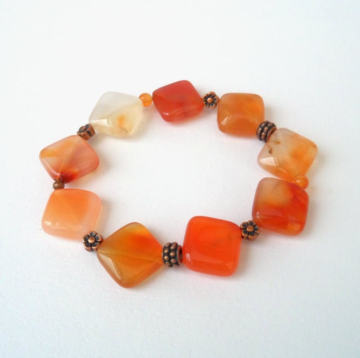 Beautiful square carnelian gemstones sit together with copper beads and small carnelians to make this stunning and unique bracelet.