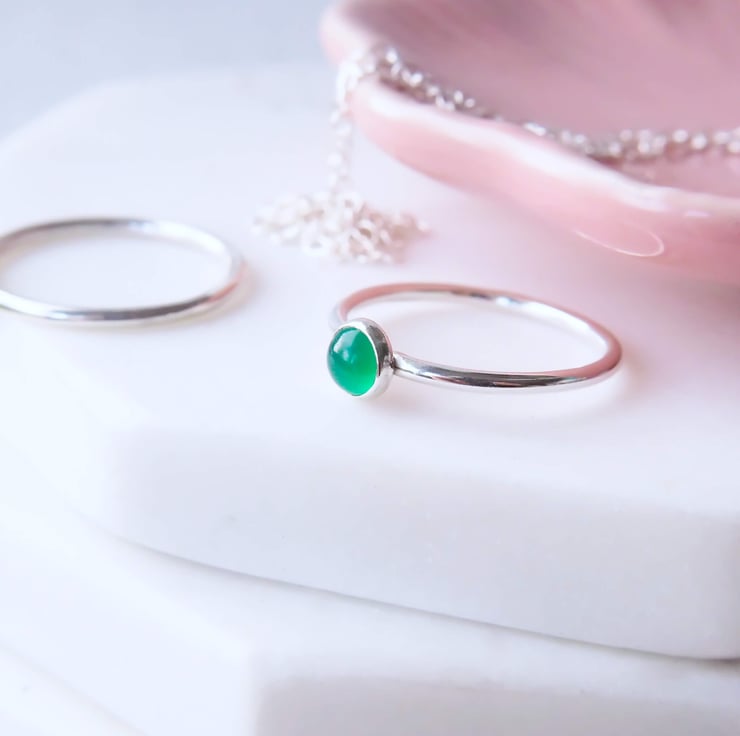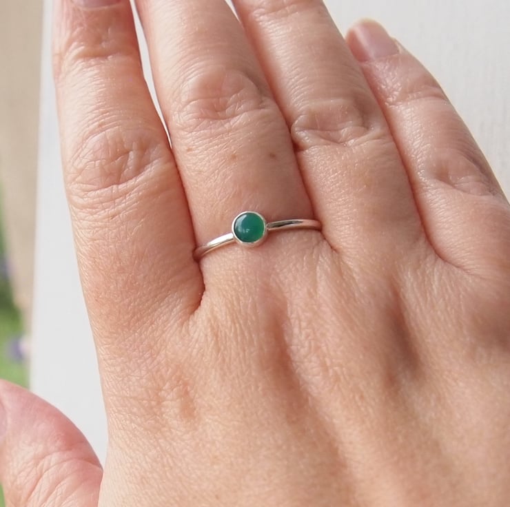 May Birthstone Ring with an emerald Green Agate round cabochon gemstone. Measuring 5mm in size, set simply onto a round band of Sterling Silver. The band is fully round 'halo' style making it a modern solitaire birthstone. It also stacks neatly with other rings from my range to create your own custom ring set. A perfect ring to wear as your birthstone, or if you just love green!