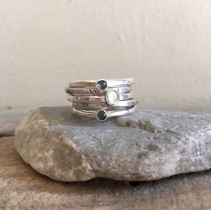 This listing is for a set of five silver stacking rings. The bands are hammered and textured (can be made without the texturing though). The gemstones are genuine topaz -- two deep London blue and one pale sky blue. They are very pretty and delicate as the cabochons measure 3mm and 4mm for the larger stone. Please state your ring size when ordering.