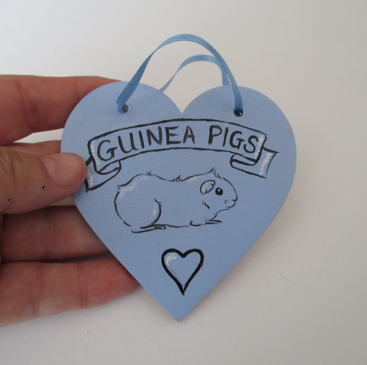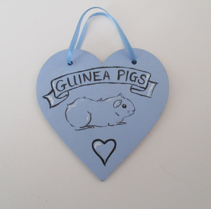 This is a pretty little wooden heart, painted in light blue, with co-ordinating ribbon for hanging, featuring a little guinea pig outline drawings, and the text 'Guinea Pigs' in a banner.