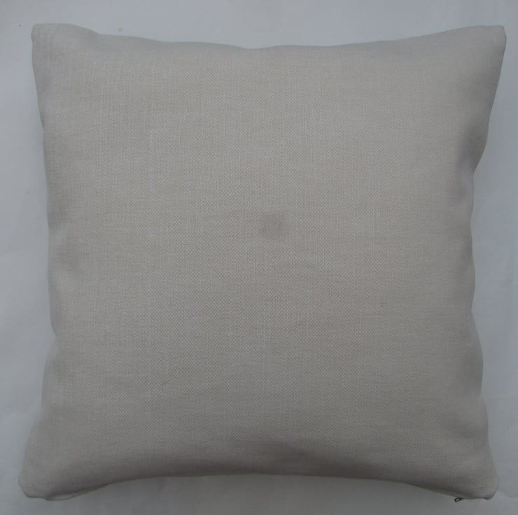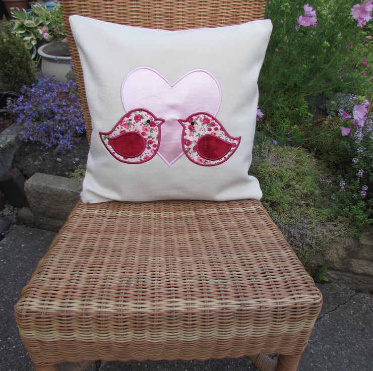 16" (40cm) cream cushion with a pair of appliqued lovebirds in a lovely rose print fabric in pretty shades of pink and red. The birds are embellished with sequin eyes and deep pink textured wings. They sit in front of a pale pink satin appliqued heart.