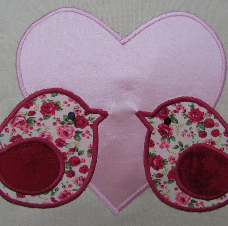 I was aiming for a romantic theme with this cushion with lovebirds beak to beak in front of a large heart. I chose the fabrics to add to the romantic theme with delicate pale pink satin for the heart and a combination of pretty floral and textured fabric for the birds.