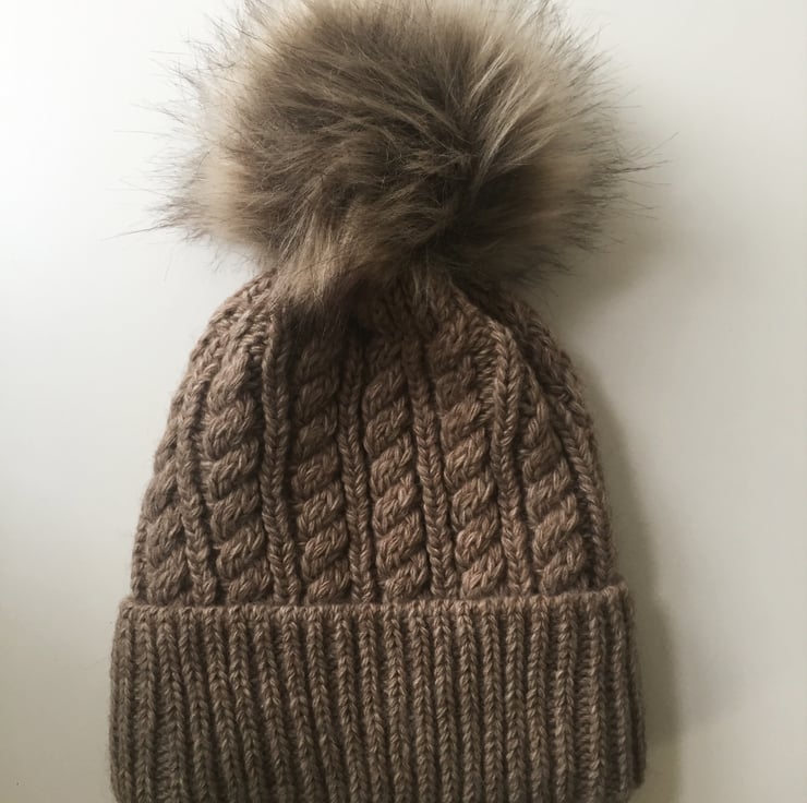 Warm knitted wool hat in light brown cables with super fluffy and soft faux fur pom pom.