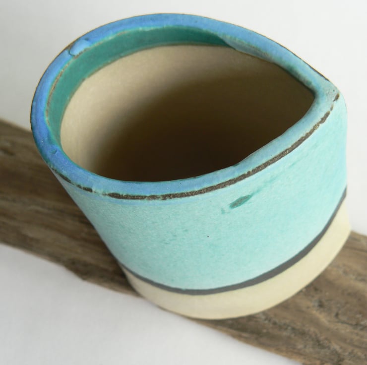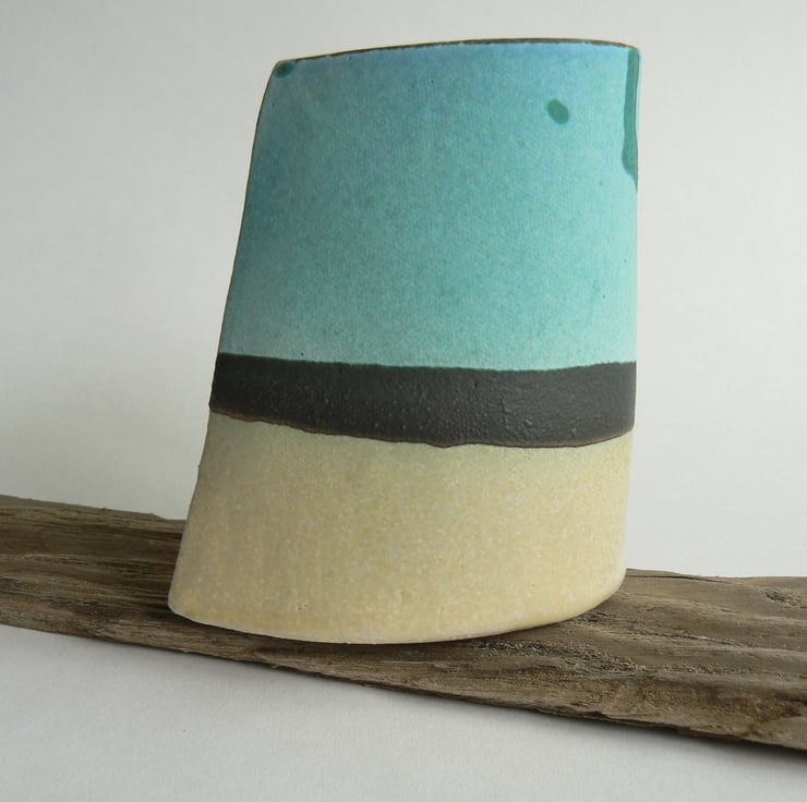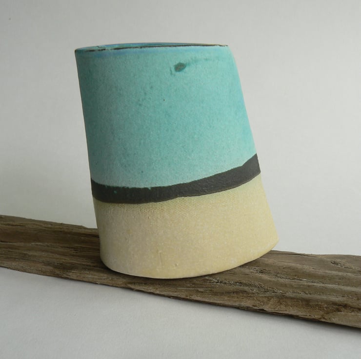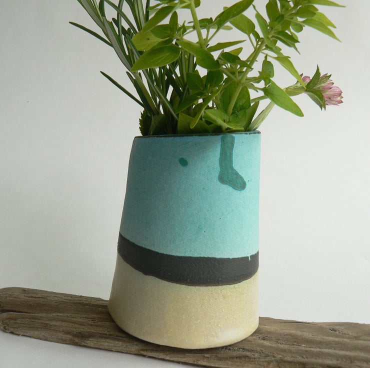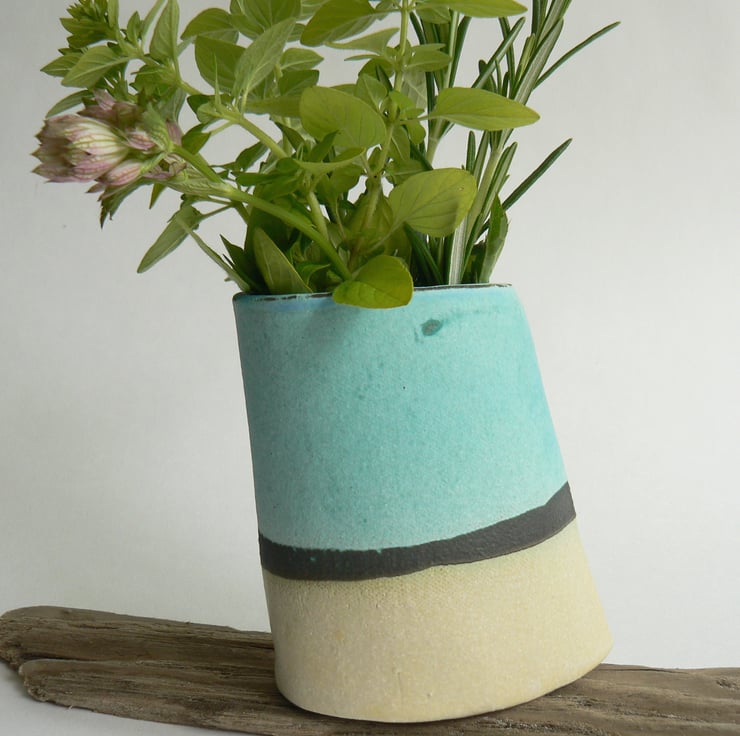A stoneware vase, double dipped-the crossover between the glazes creates the landscape feature. I use a dry turquoise and matt white on the outside and a clear shiny glaze inside to make it easy to clean.
