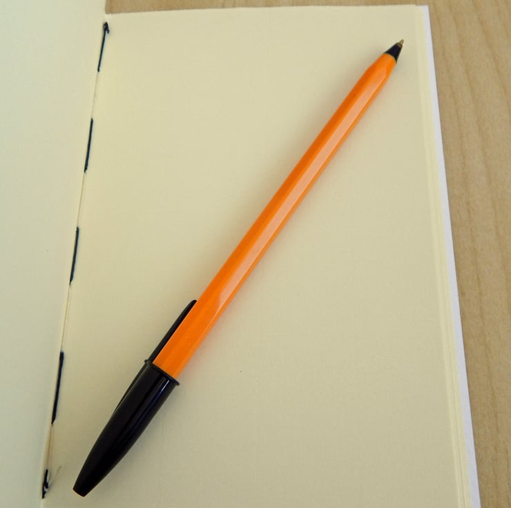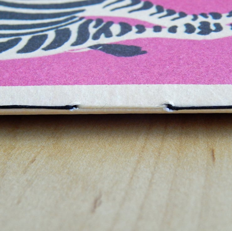 Inside there are 30 pages, in one section, which are hand bound along the length of the cover, with linen thread. The binding stitches are alternately black and white, like the zebra stripes.
