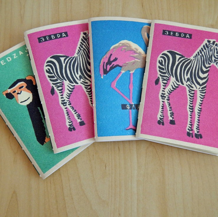 The book is made from a greetings card, with a design from a Vintage Russian matchbox - a zebra printed on a bright pink background, with the word "Zebra" in Russian characters.