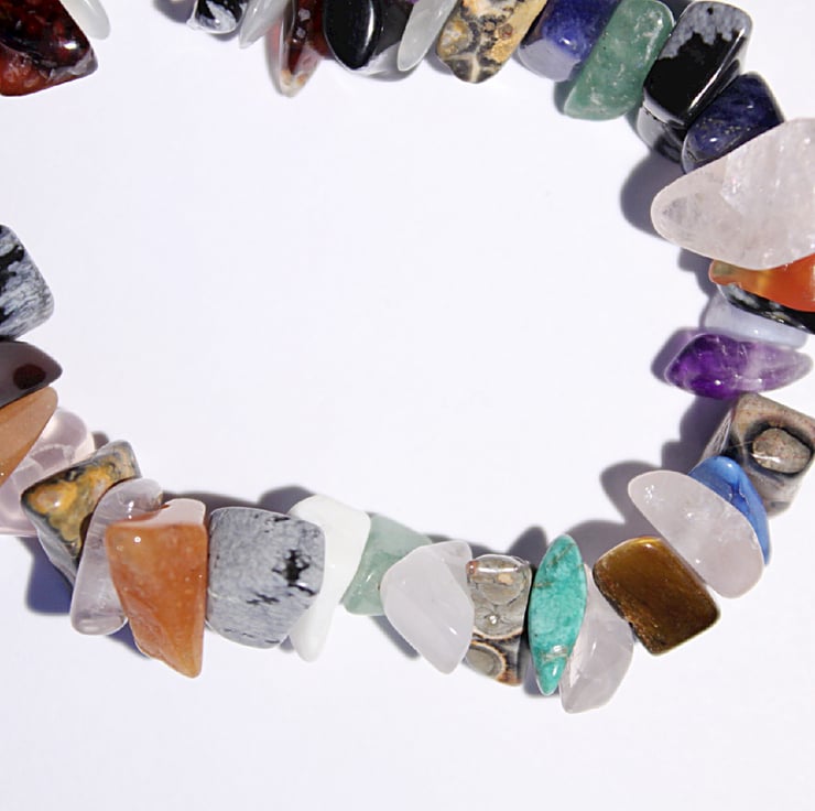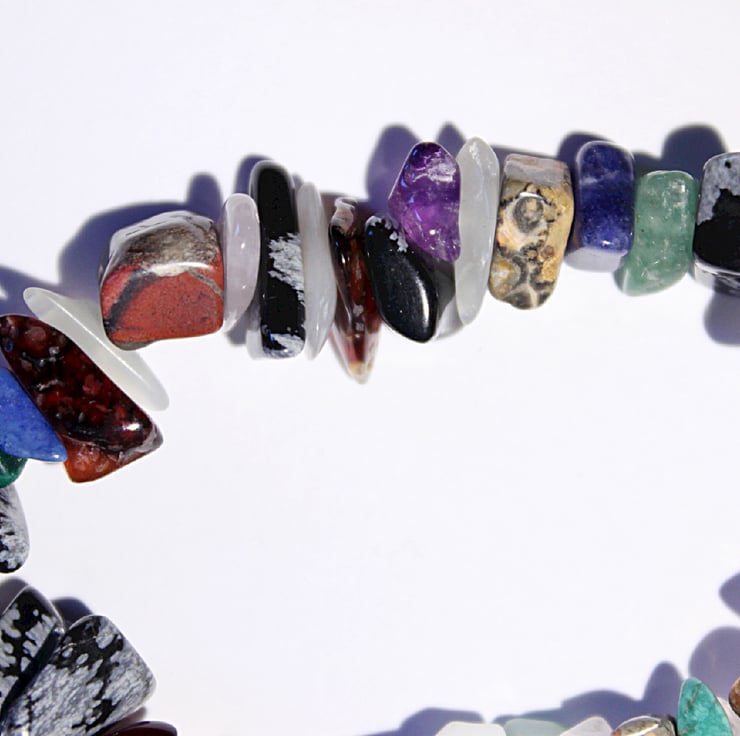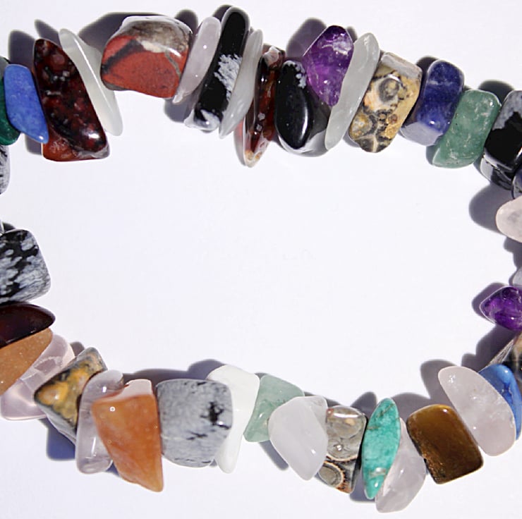 A gemstone chip bracelet made from polished chips of assorted gemstones. There are chips of snowflake obsidian, rose quartz, tiger eye, aventurine and various jaspers and agates amongst the selection. Overall, this is a pretty and delicate bracelet in a beautiful array of colours.