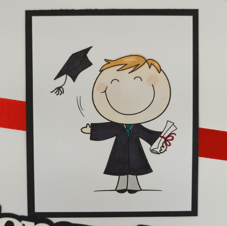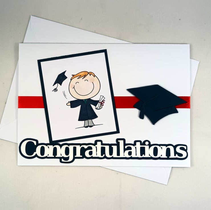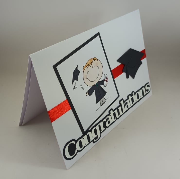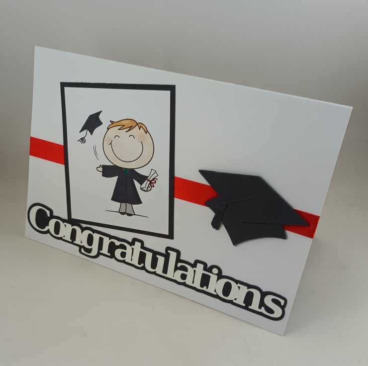 Graduation congratulations card featuring a hand coloured image of a male graduate celebrating, together with a die cut mortar board, red satin ribbon and the message 'Congratulations', which has been cut out and layered onto black card.