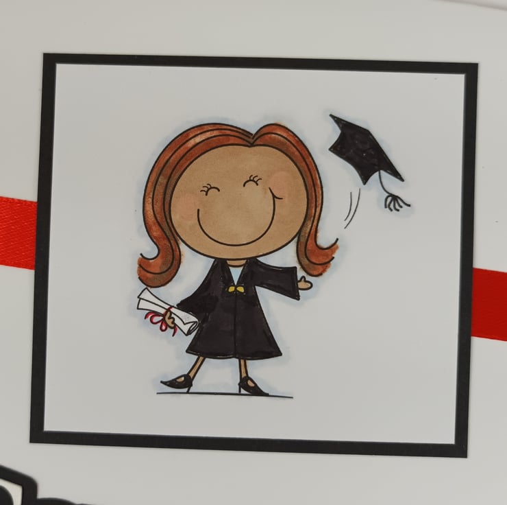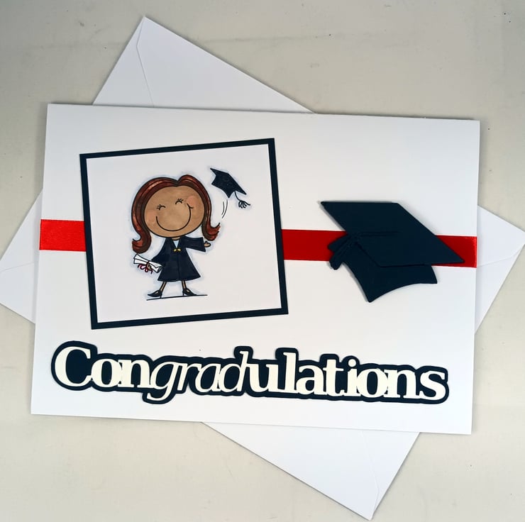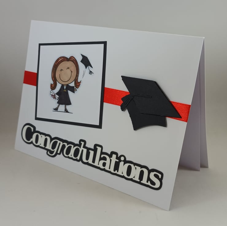 Graduation congratulations card featuring a hand coloured image of a female graduate celebrating her success, together with a die cut mortar board, red satin ribbon and the slightly different message 'Congradulations', cut out and layered onto black card.