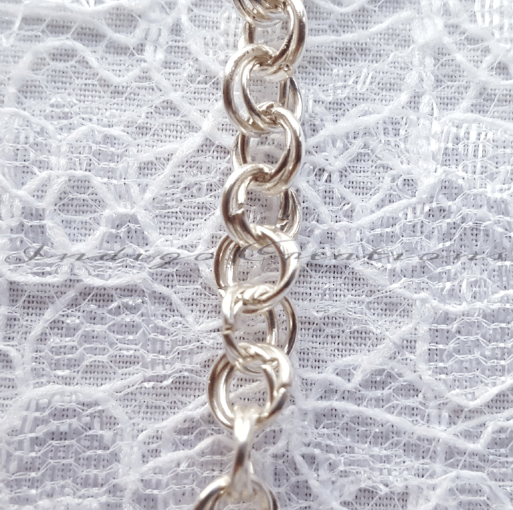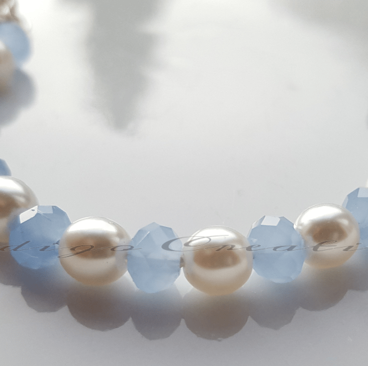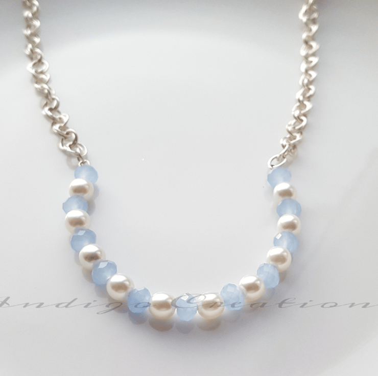 This elegant necklace has a mixture of faux pearls and pale blue faceted beads in a horseshoe shape and they are attached to a silver plated chainmaille necklace.