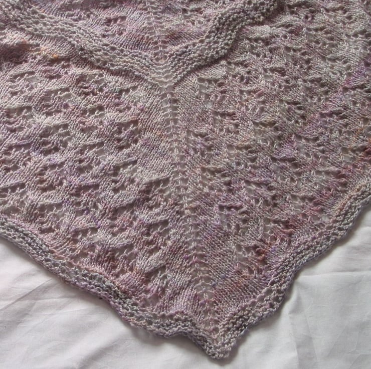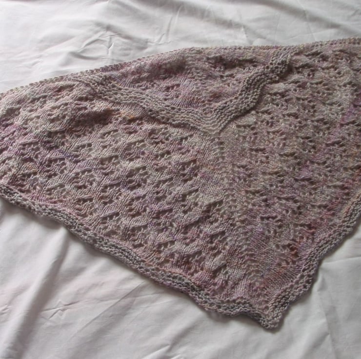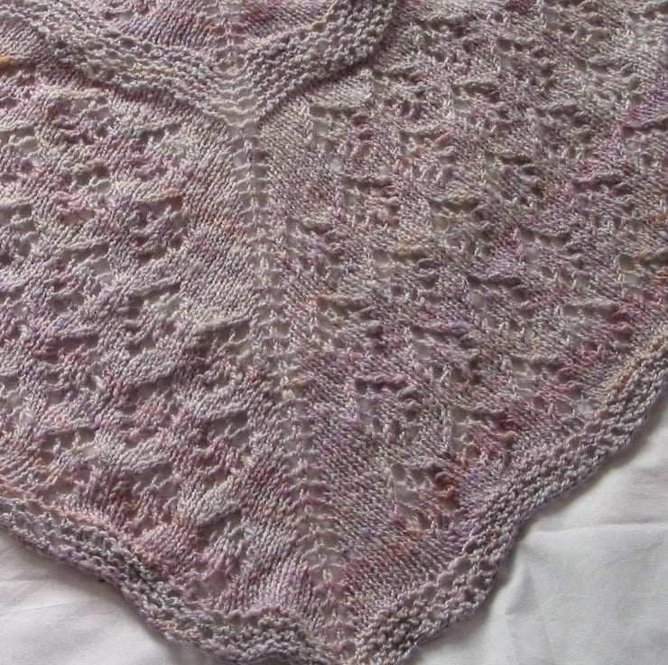 elegant small shawl sits neatly over the shoulders. 49ins wide 25 ins long Knitted in 4 ply yarn on 5mm needles. extra depth can be added by increasing the edging, but this will require more yarn. Pattern takes 100gm.