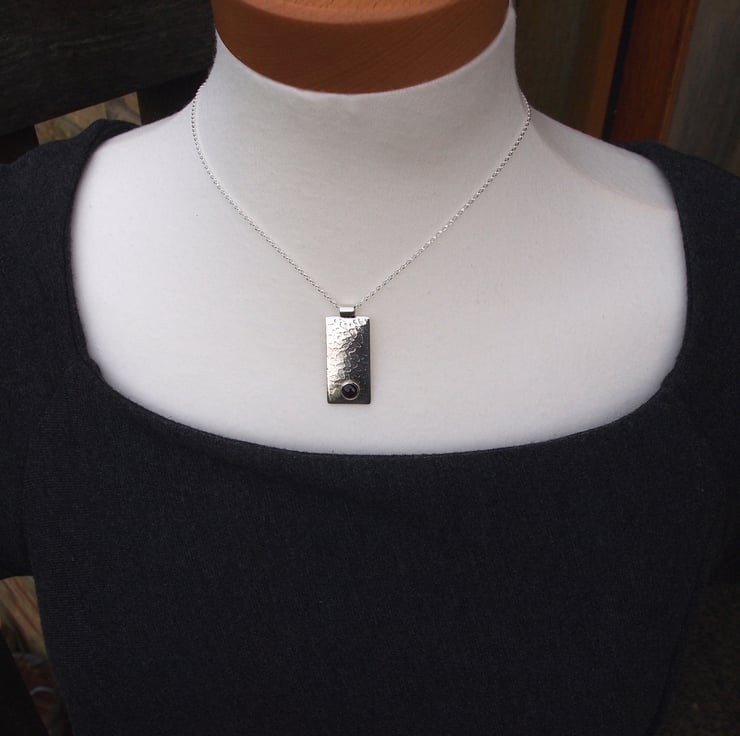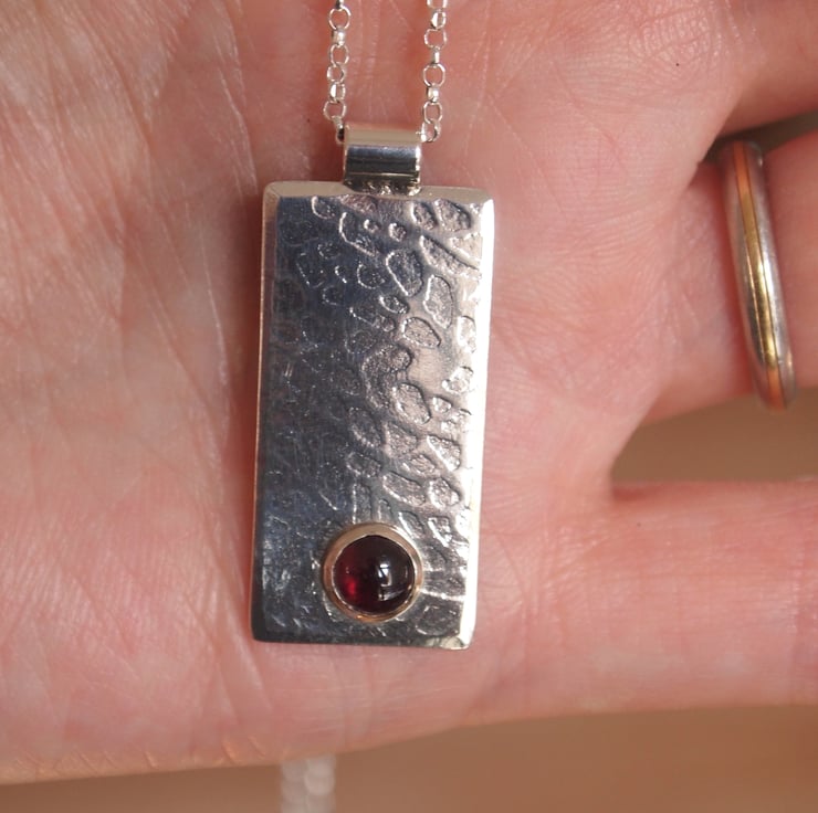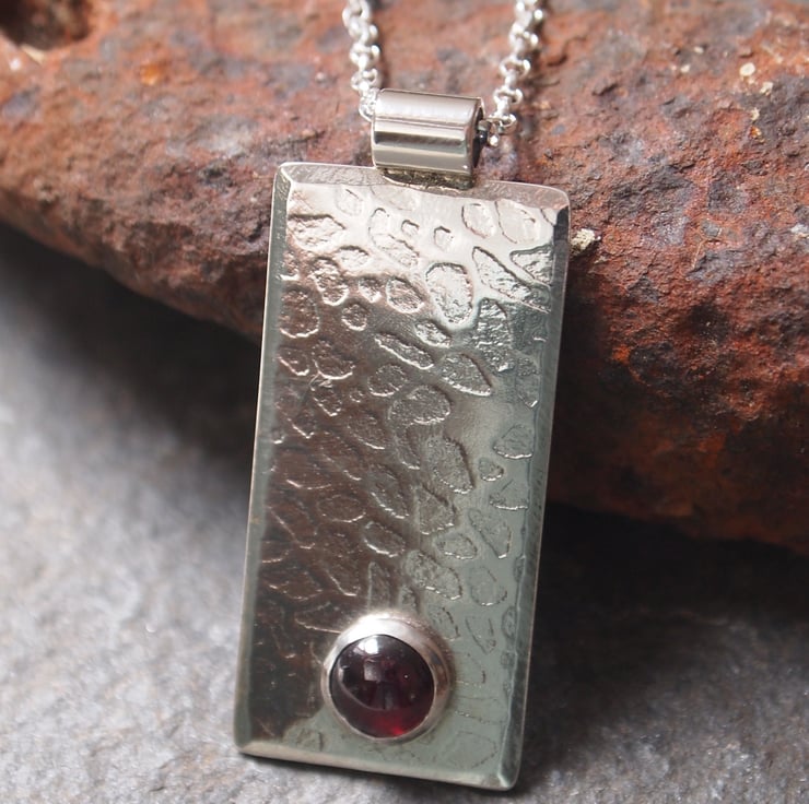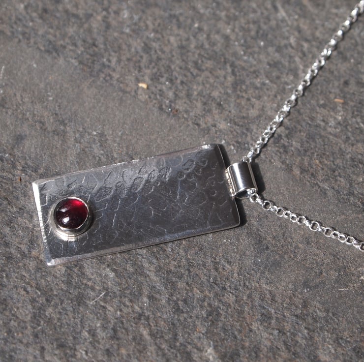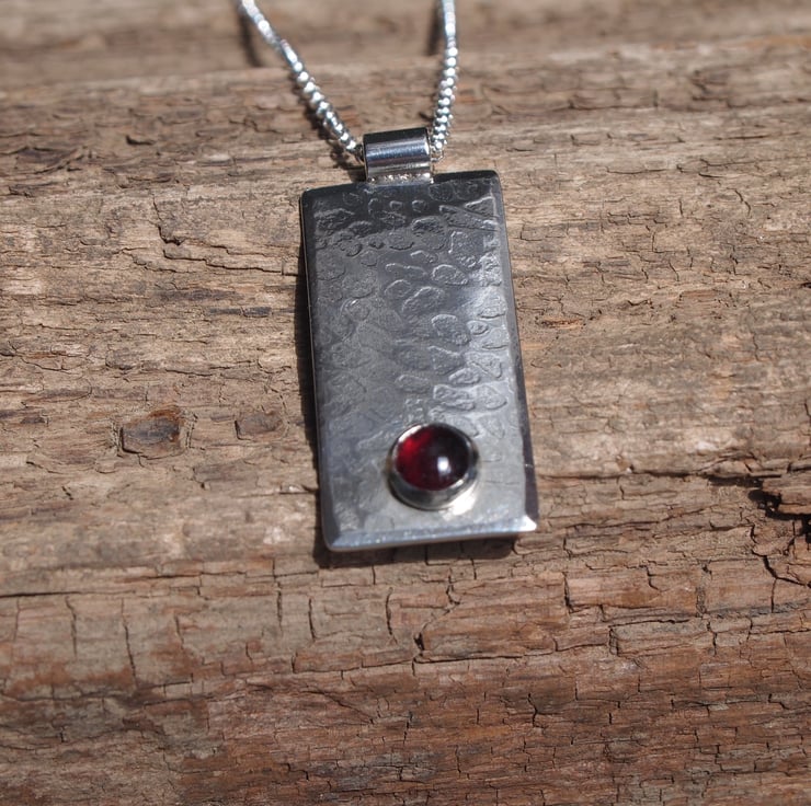 A hand cut rectangle of sterling silver has been textured with a very subtle surface pattern and set with a deep red wine colour garnet cabochon. The silver has been polished to a bright shine to finish. It comes with a sterling silver diamond cut belcher chain.
