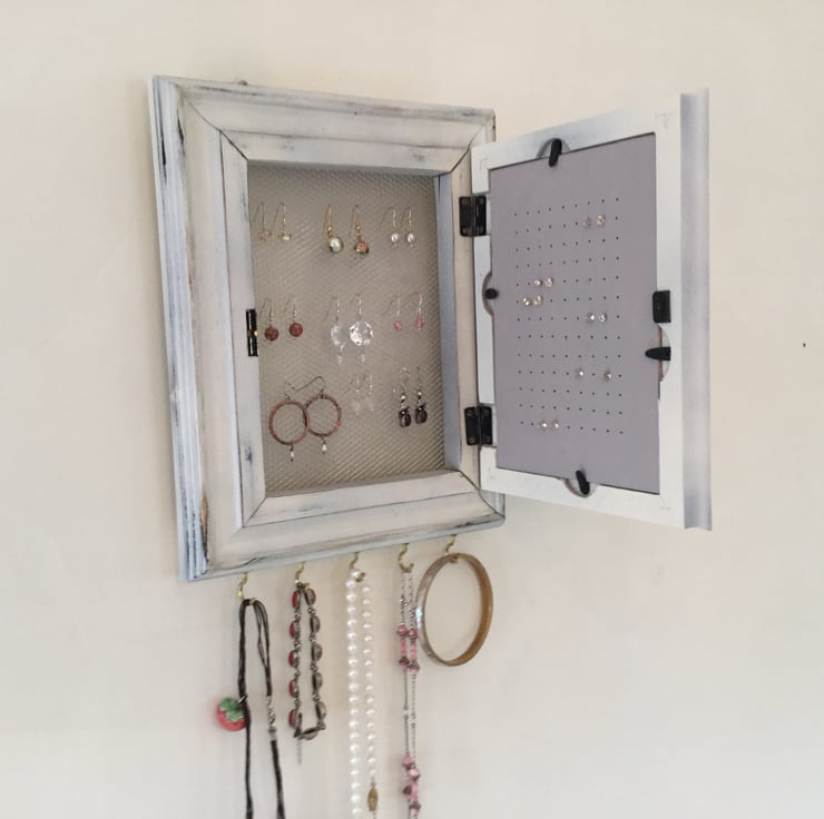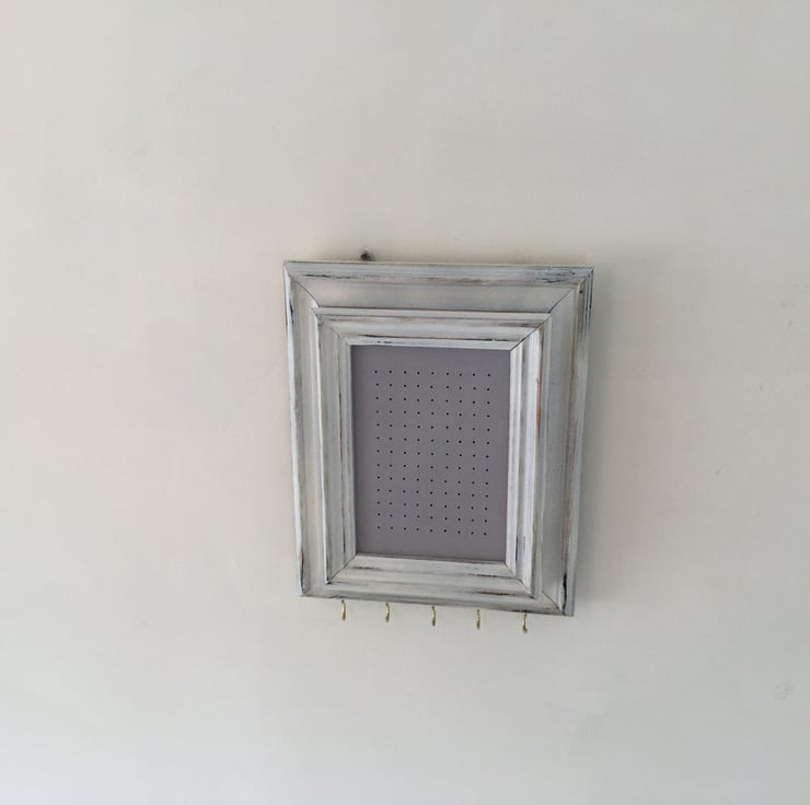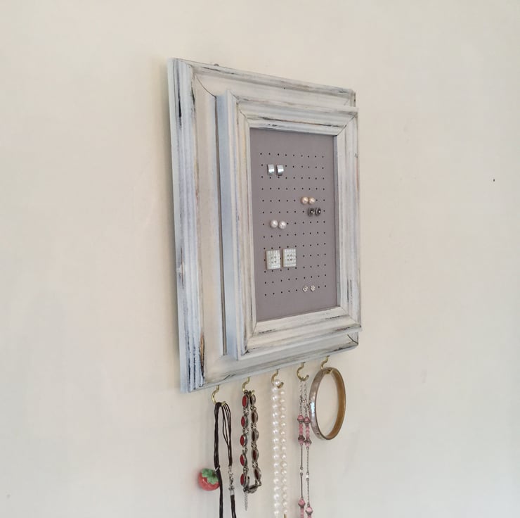 This jewellery organiser is a repurposed key box! I painted the frame Ivory and the stud earring organiser grey. I applied a subtle antique gold paint to accentuate key features then lightly distressed the paintwork to give it an antique feel. Finally I waxed the paintwork to give it a protective coat and a beautiful subtle sheen.