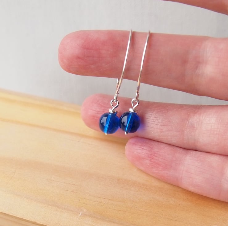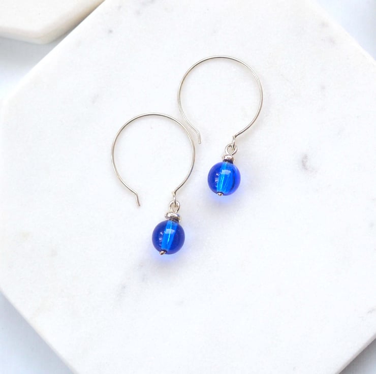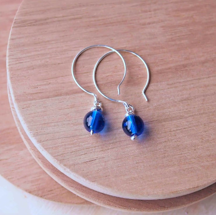 Simple Sterling Silver and blue glass earrings. Made from a handmade sterling silver hoop, with a bright blue glass bead attached to the bottom. On each side of the blue glass bead is a handmade silver bead, made for scraps of my silver to create and eco friendly earring. These handmade silver earrings are made by me in my studio in Edinburgh.