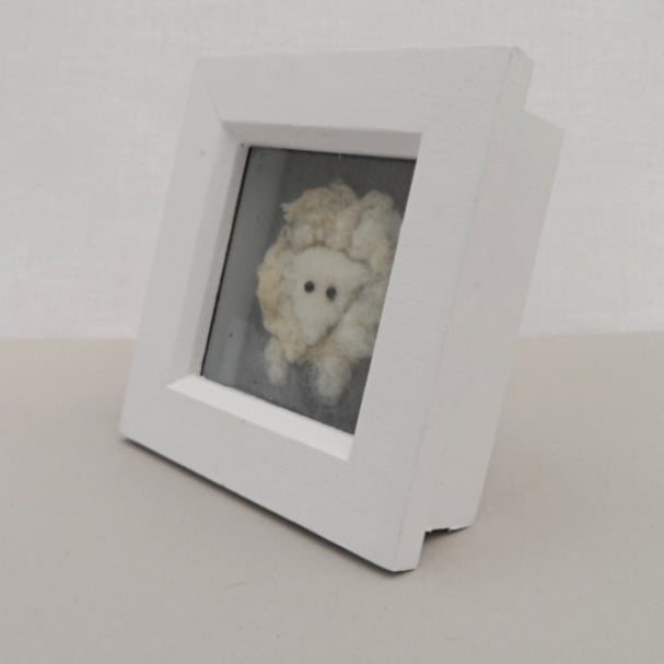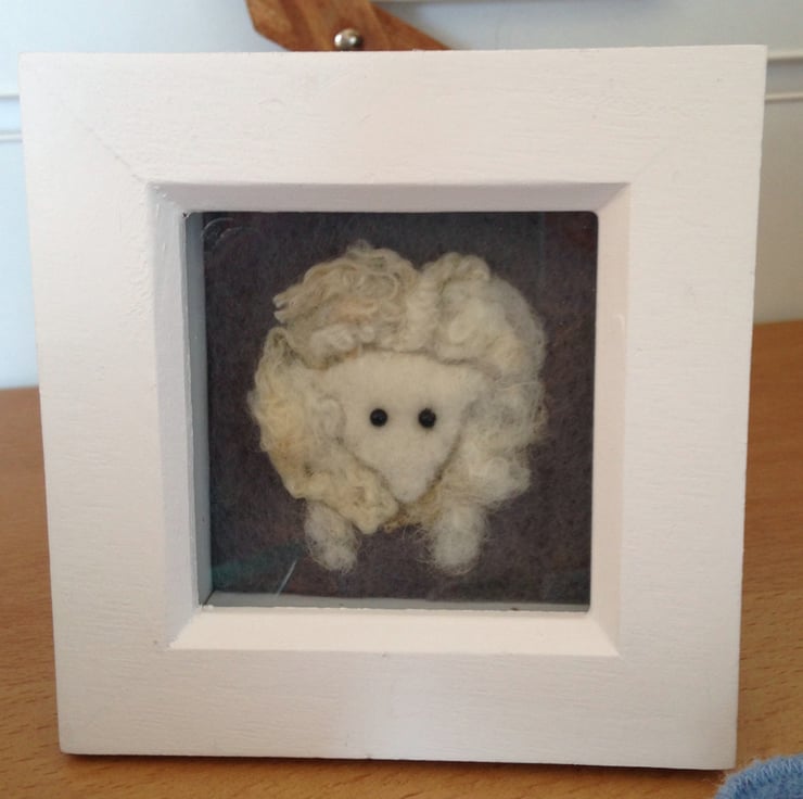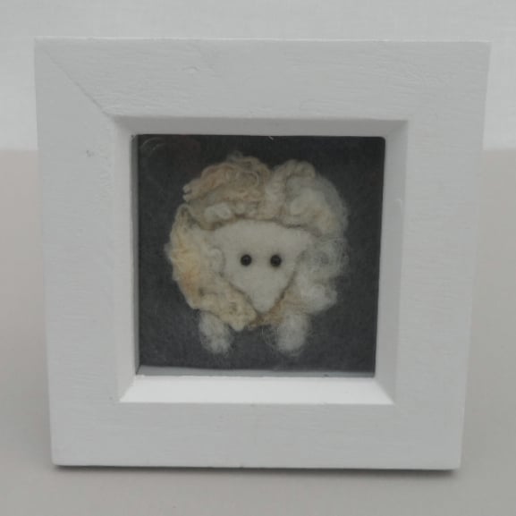 This picture has been needle felted using natural white wensleydale curly wool locks needle felted onto a dark grey merino wool felt background. The sheeps face has been made using white merino wool felt and two small black beads have been sewn on to create the eyes. The whole picture has been framed in a small white painted wooden box frame measuring 10.5cm x 6.5cm and 3.5cm deep (all measurements are approximate). A metal hanging loop is provided on the reverse of the frame.