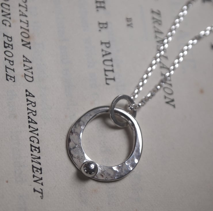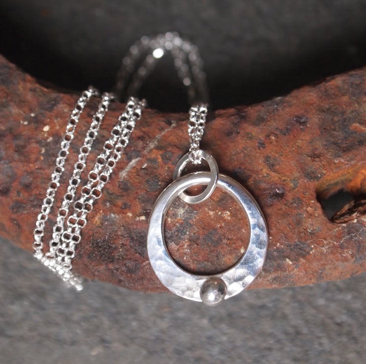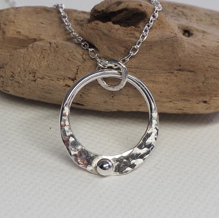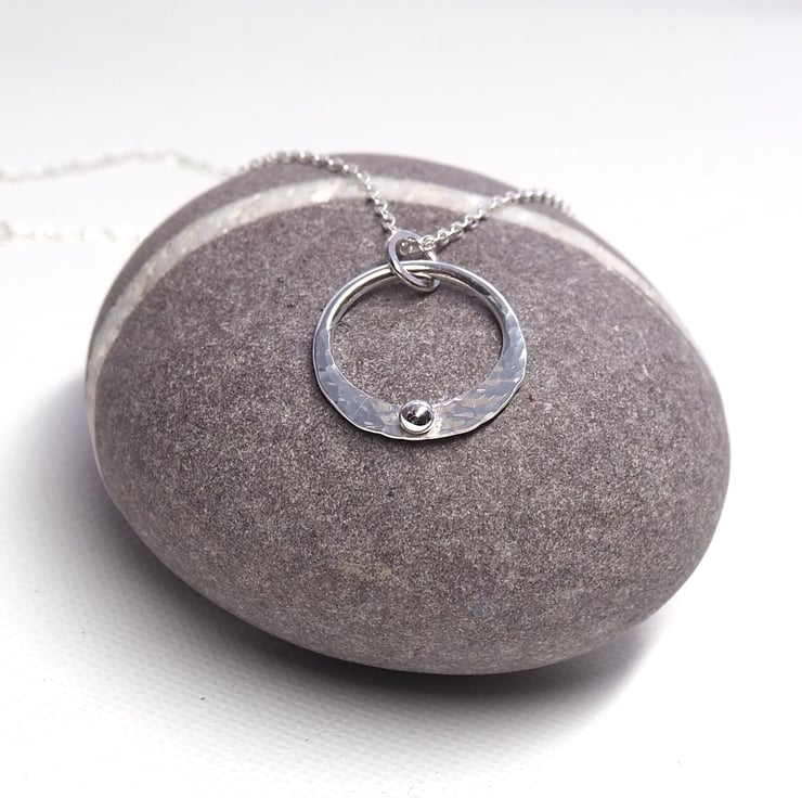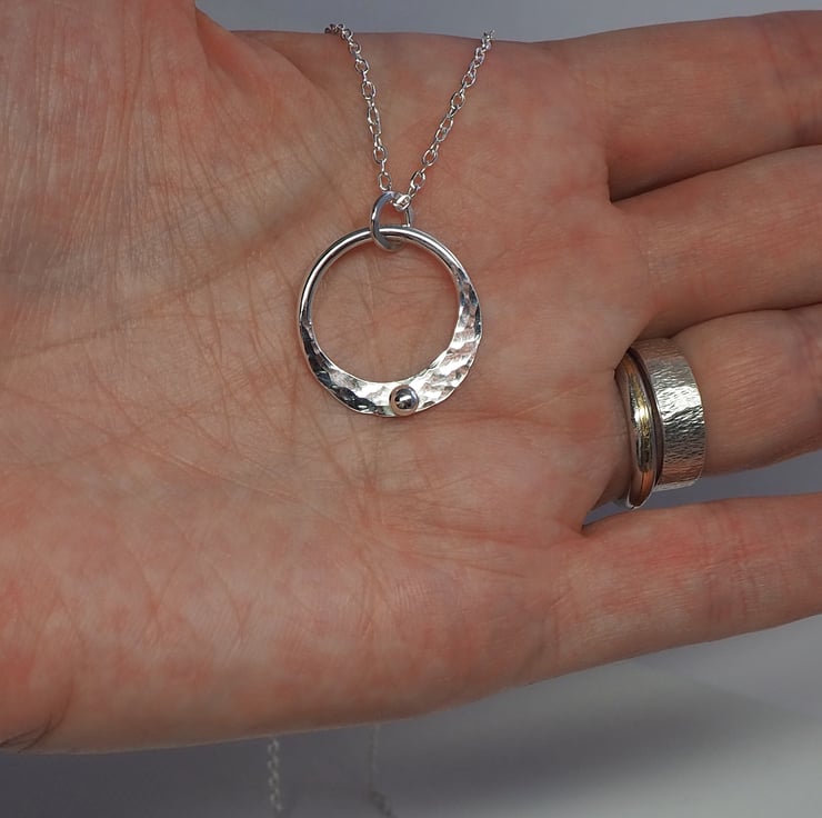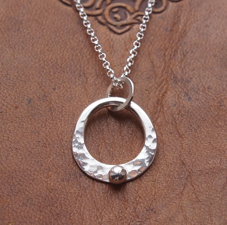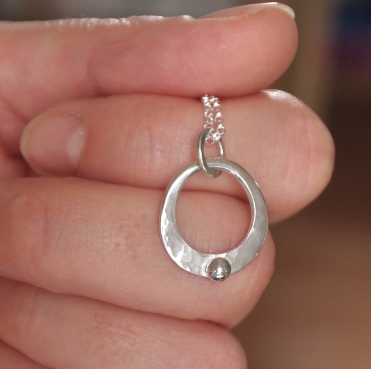 This unisex pendant is formed from a ring of Argentium silver 940 that has been hammered along one side to flatten it. A dimpled surface texture has been added by further hammering and a little ball of recycled sterling silver has been added to embellish the design.
