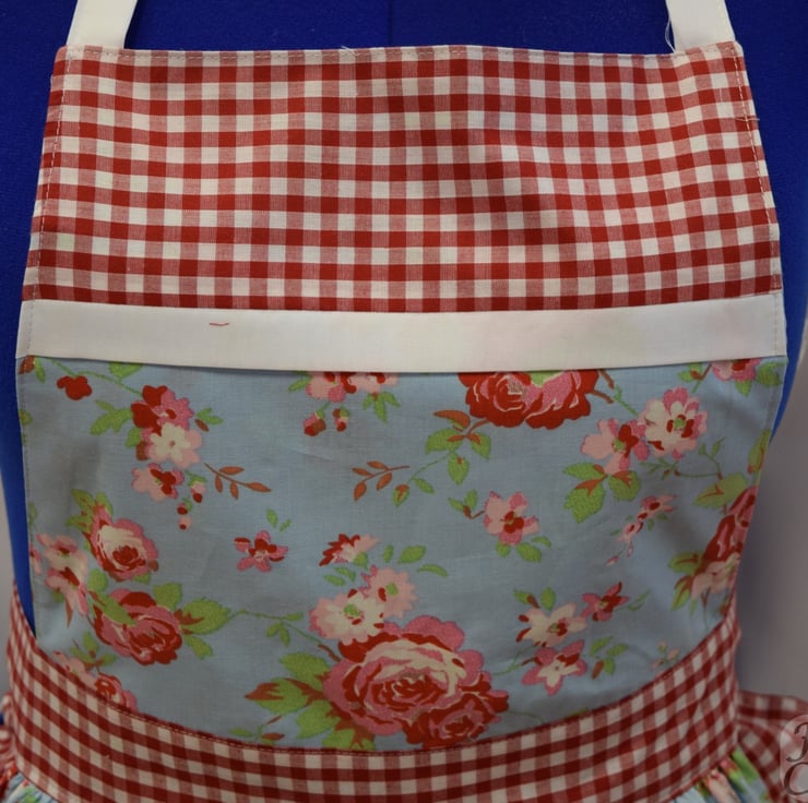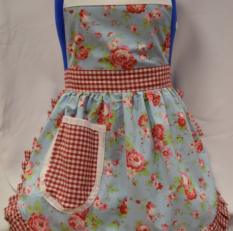 Here we have a lovely cotton rich Cath Kidston fabric, pale blue with roses & red and white gingham trim retro style apron, handmade in house to our own design. (see photos). Adjustable neck and waist ties so will fit up to a size 22.