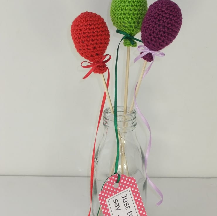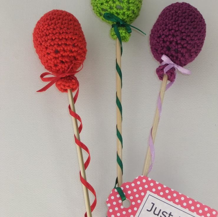 An unusual way to send a special message that makes a change from an ordinary greeting card and leaves the recipient with a cheerful keepsake. These three balloons have been crocheted in cotton and lightly filled with a polyester stuffing. They are each tied to a length of narrow ribbon and are also glued to bamboo stick so that they can be displayed in a vase, bottle or a pot plant or even used as cake toppers! The possibilities are many! The ribbons come wrapped round the sticks but are intended to hang loose when displayed. There is a ‘Just to say’ tag tied to the end of one of the ribbons for you to send a message with the balloons. A longer message could be included in the presentation box. The box is a uniquely customised PIP (Postage in Proportion) box which means that the balloons can be sent at the large letter rate rather than as a parcel (they will need a tiny bit of plumping up after their journey!) The balloons measure between approximately 23 cm and 25 cm including the sticks.