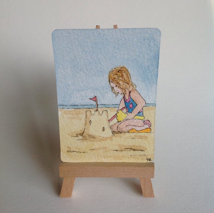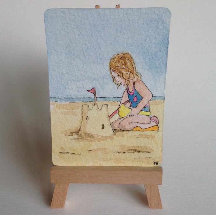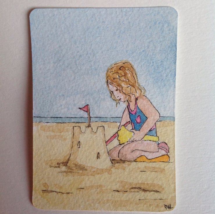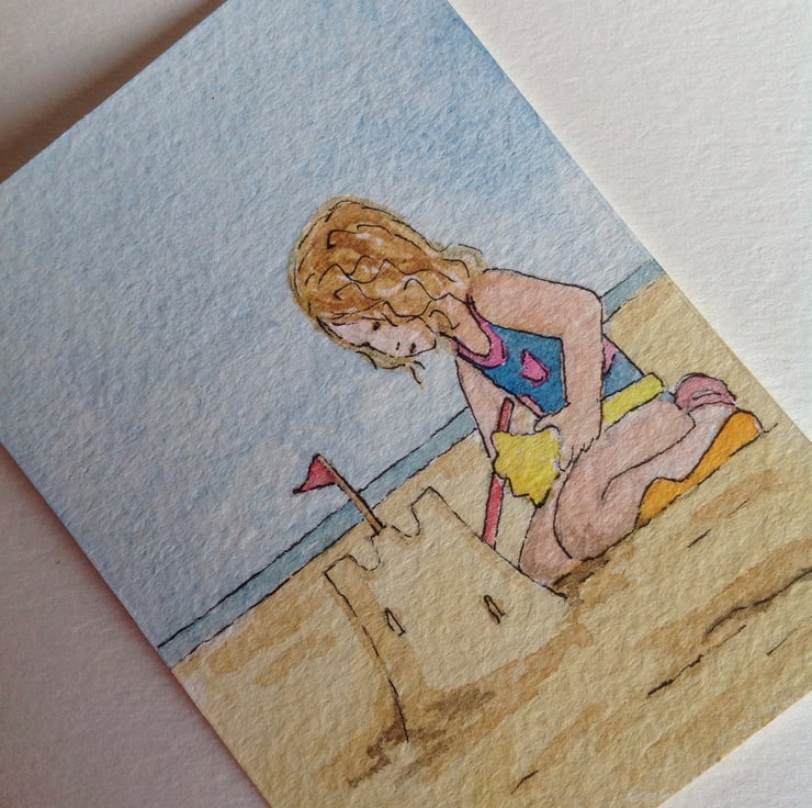 Summer holidays, beaches and the concentration of a little girl just finishing the building of a sandcastle! This ACEO records the moment in a little watercolour measuring 2.5 inches X 3.5 inches (64mm X 89mm).