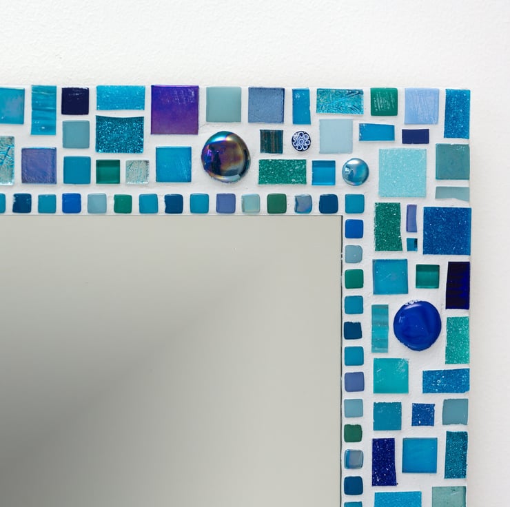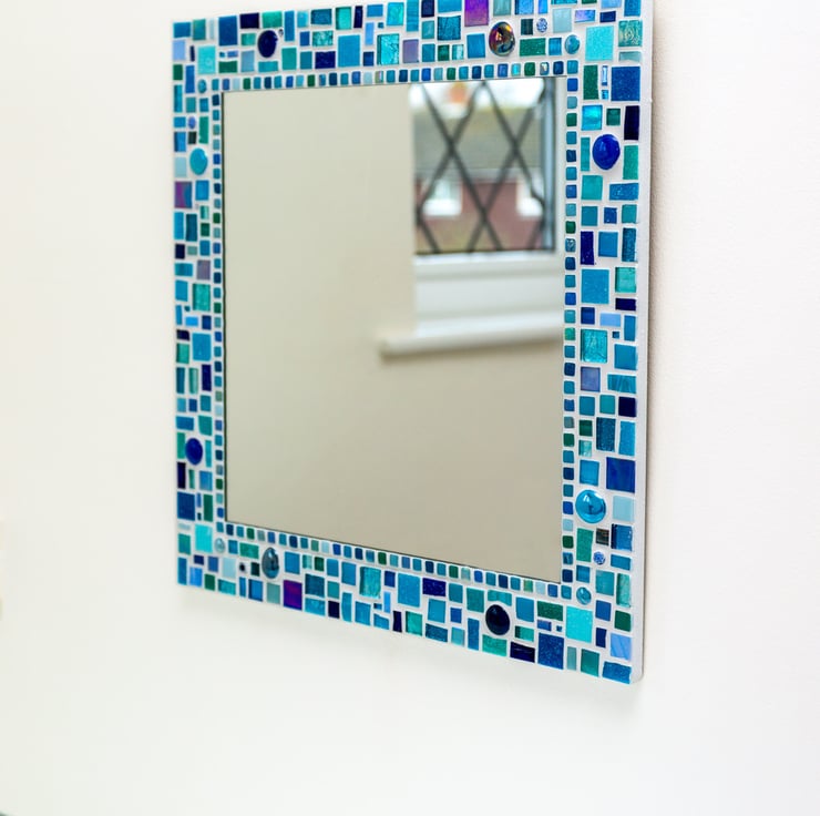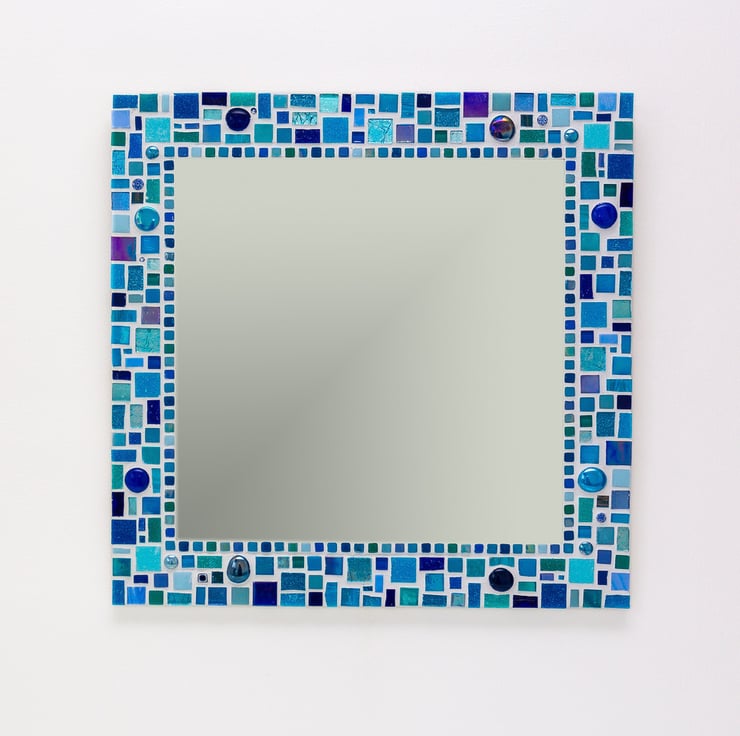 A beautiful square mosaic mirror in shades of blue and turquoise.