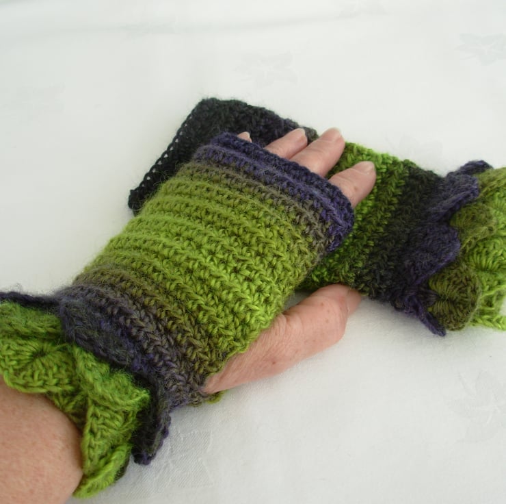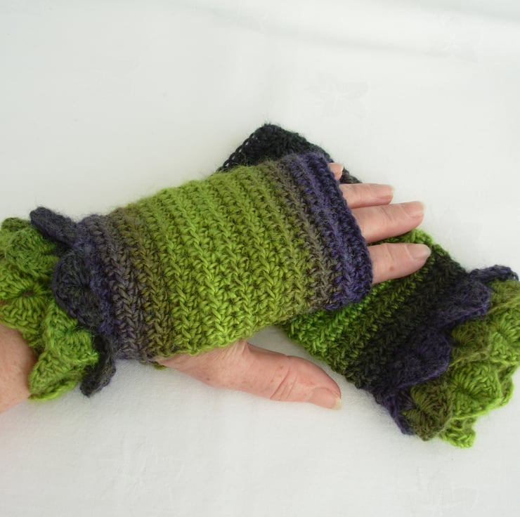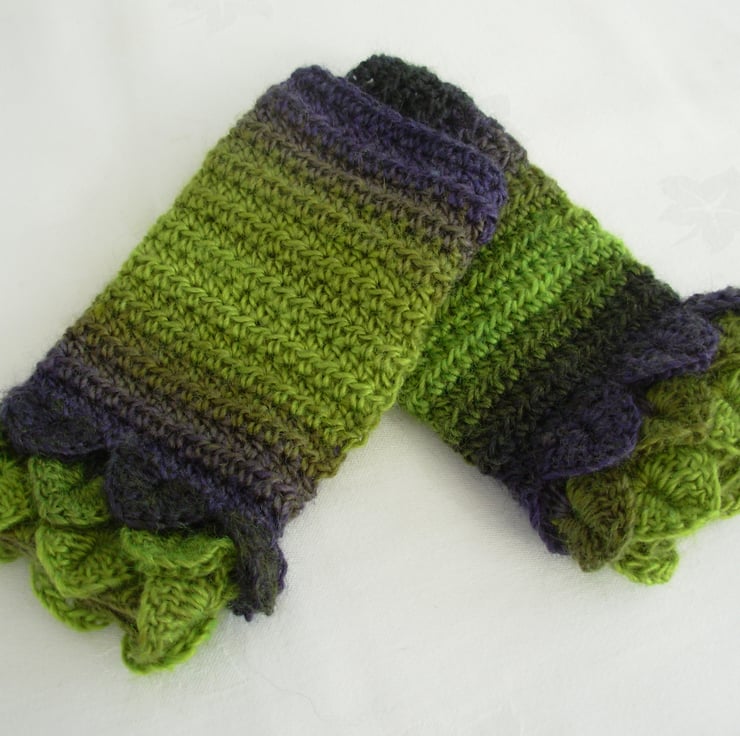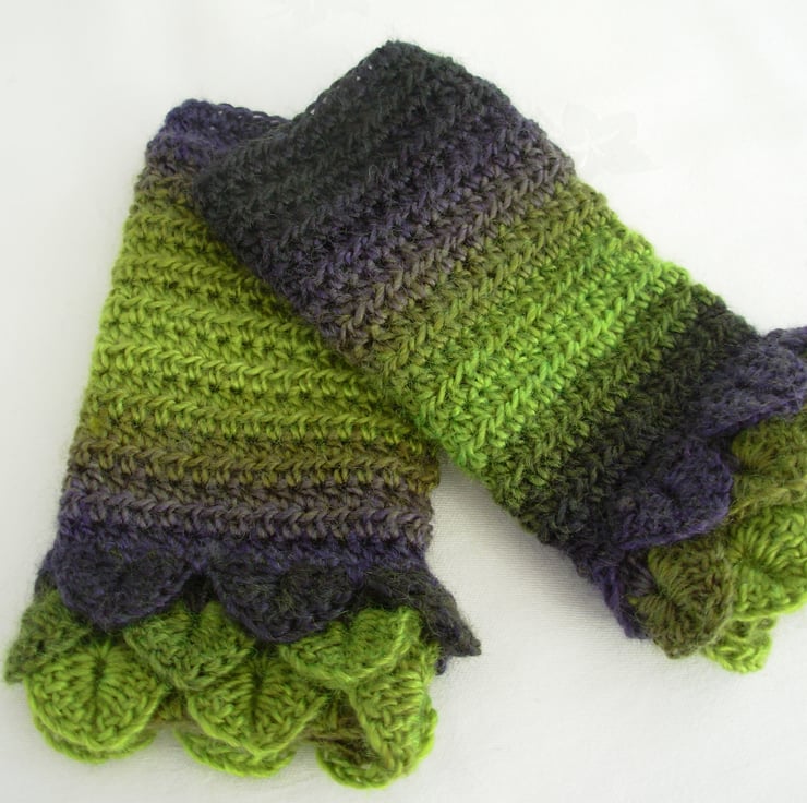 These fun and cosy adults fingerless mitts cum wrist warmers are crocheted in a soft wool and acrylic double knit yarn in graduated purple, lime and moss green. They have three layer crocodile stitch cuffs and plain body.