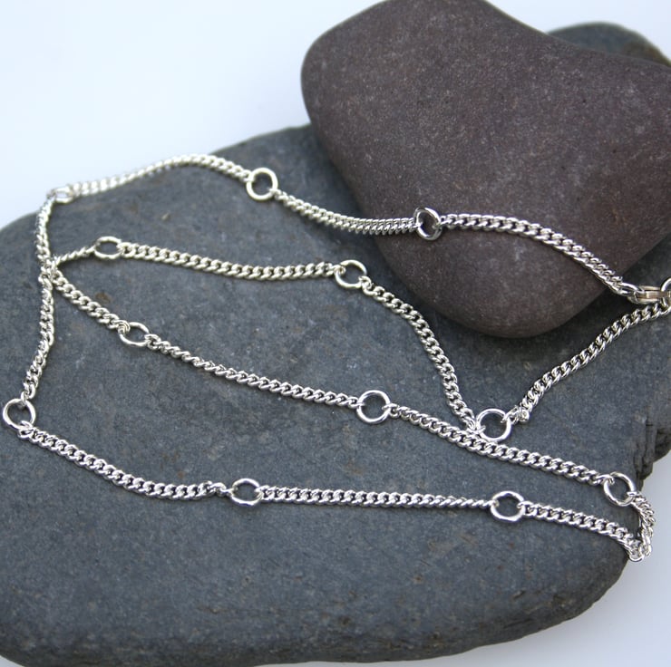 20" long chain with small spaced 4mm O rings as a feature. The necklace can be worn shorter by closing the clasp at any of the rings . All the links are soldered closed for strength.