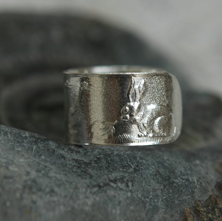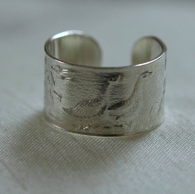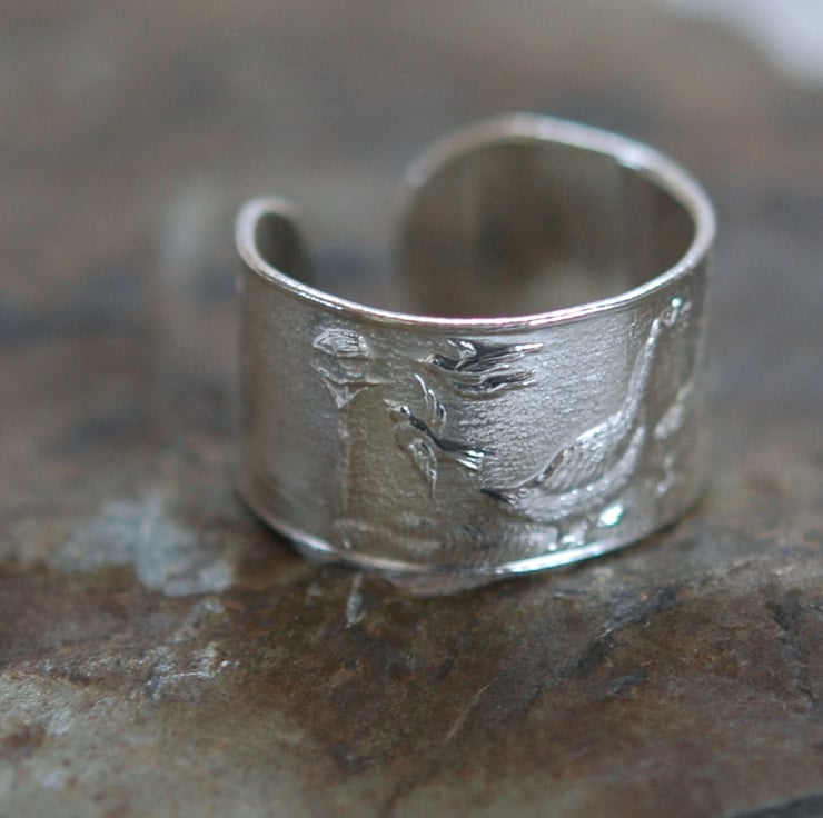 Perfect for bunny-huggers of all ages! This charming ring is made from 1cm sterling silver strip imprinted with farmyard scenes. The pattern repeat is 22cm so the exact combination of animals will depend on what I have in stock at the time - this one features a rabbit nibbling a leaf, two geese, birds flying to a feeder and a house. The ring is open and can be adjusted for size. This one will fit fingers from about size J upwards, so it would fit a child from about 7 years old and could even be worn by an adult as a pinky ring. It has been tumble-polished to a high shine.