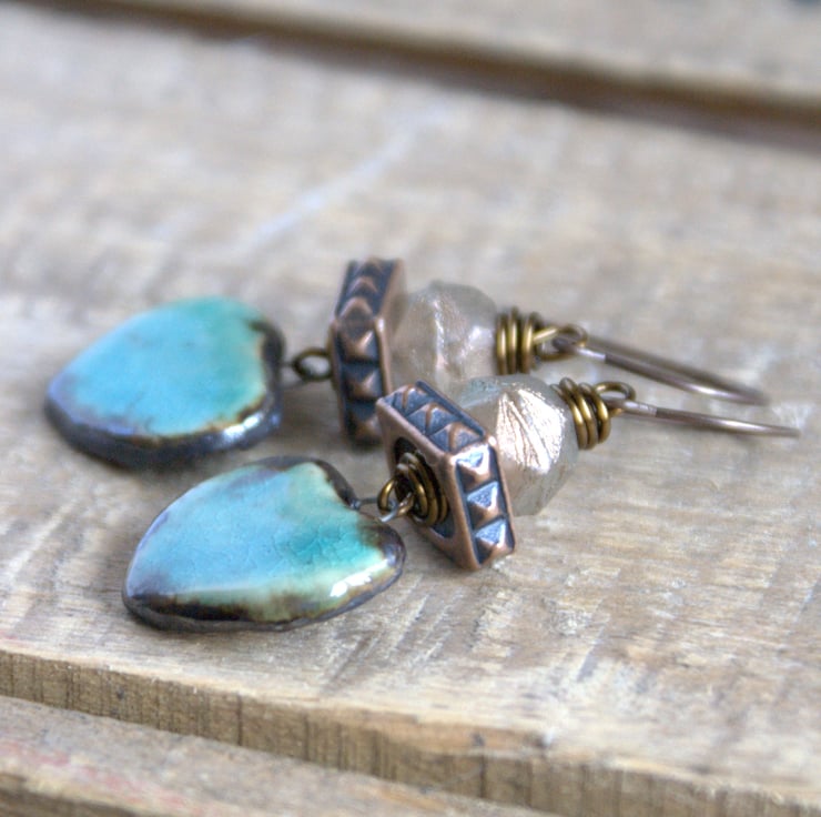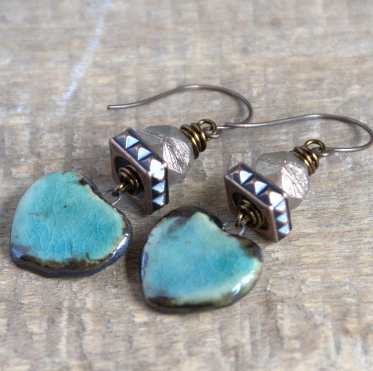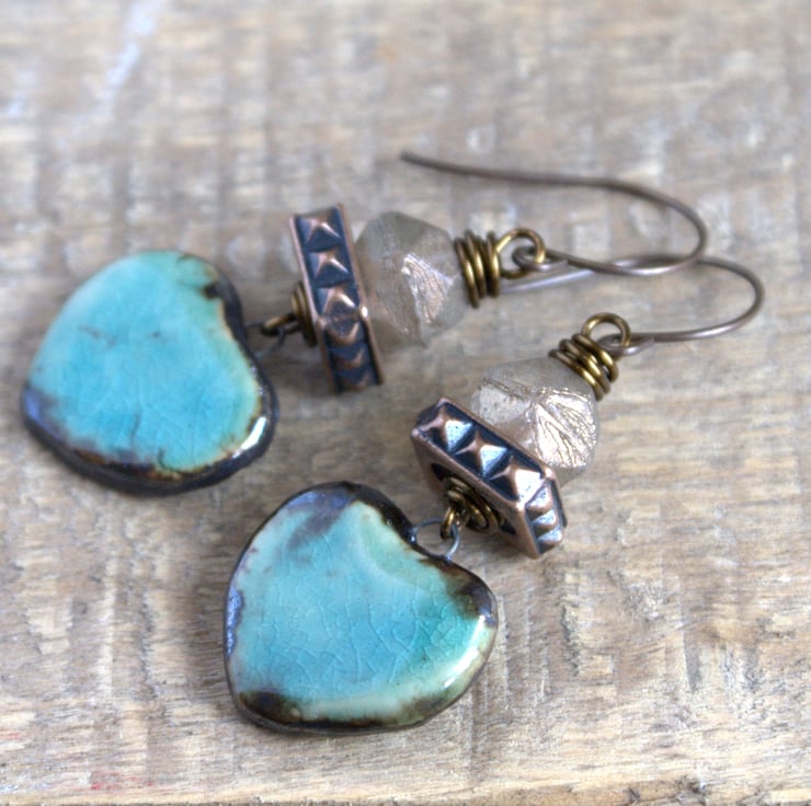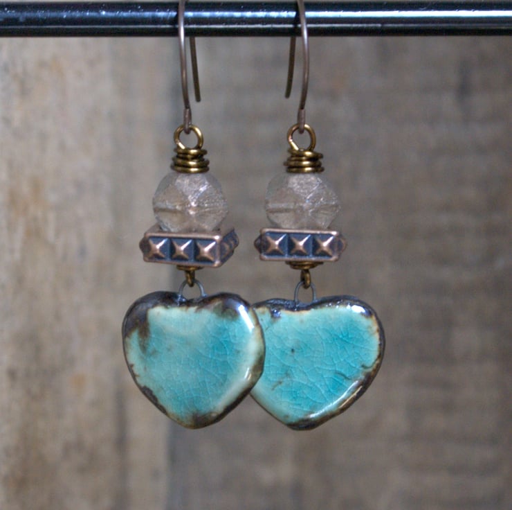 This unique pair of earrings feature ceramic heart-shaped charms, which have been handmade by HappyFishThings in the Czech Republic. The charms have a beautiful soft aqua crackle glaze on the front and a rustic texture on the back.