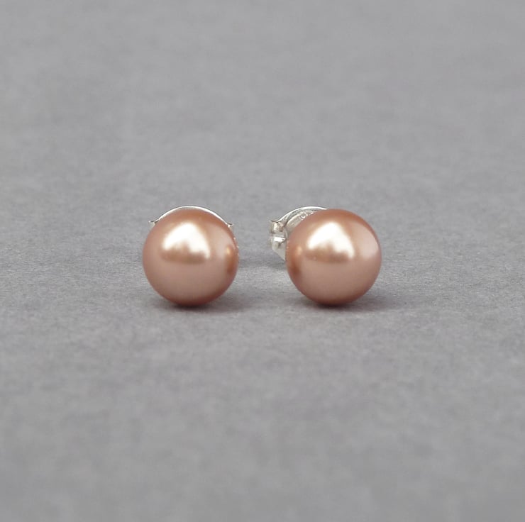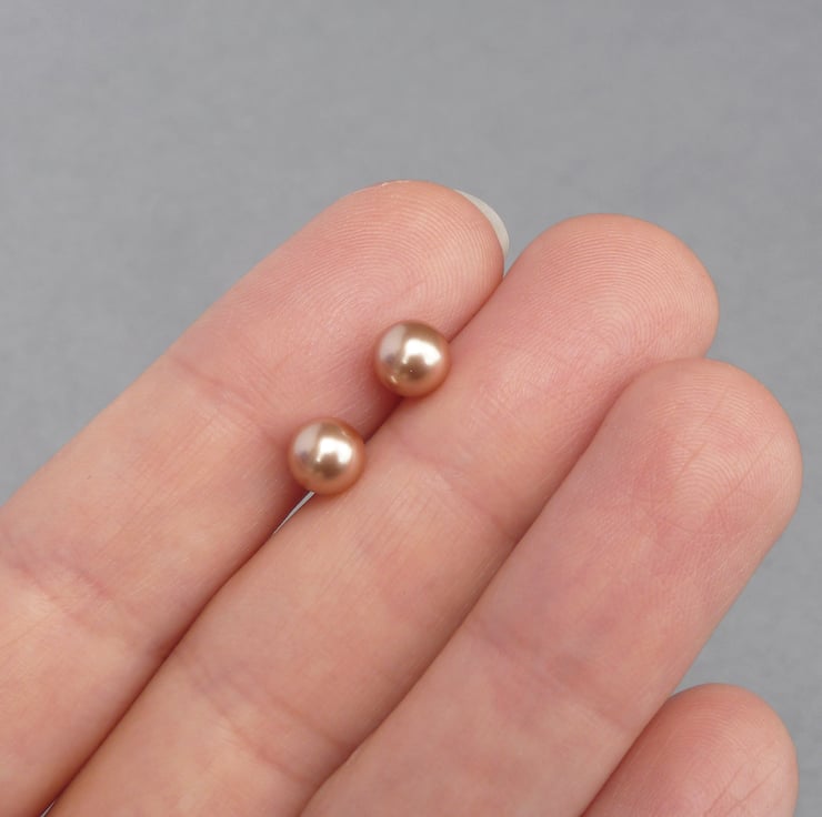 This cute pair of round stud earrings has been created using 6mm rose gold glass pearls. As each pair arrives individually gift wrapped, these copper pearl studs make perfect gifts.