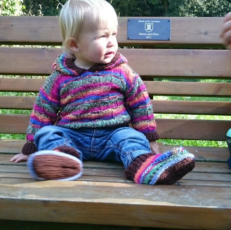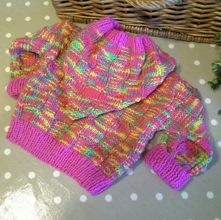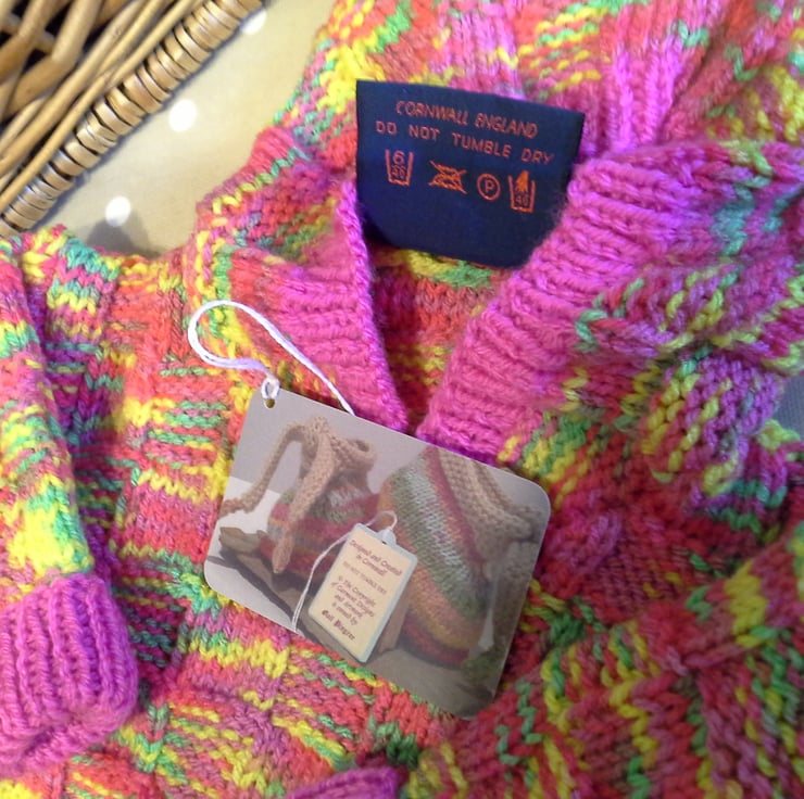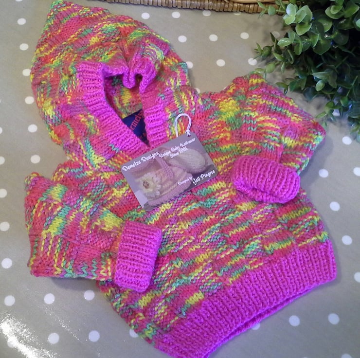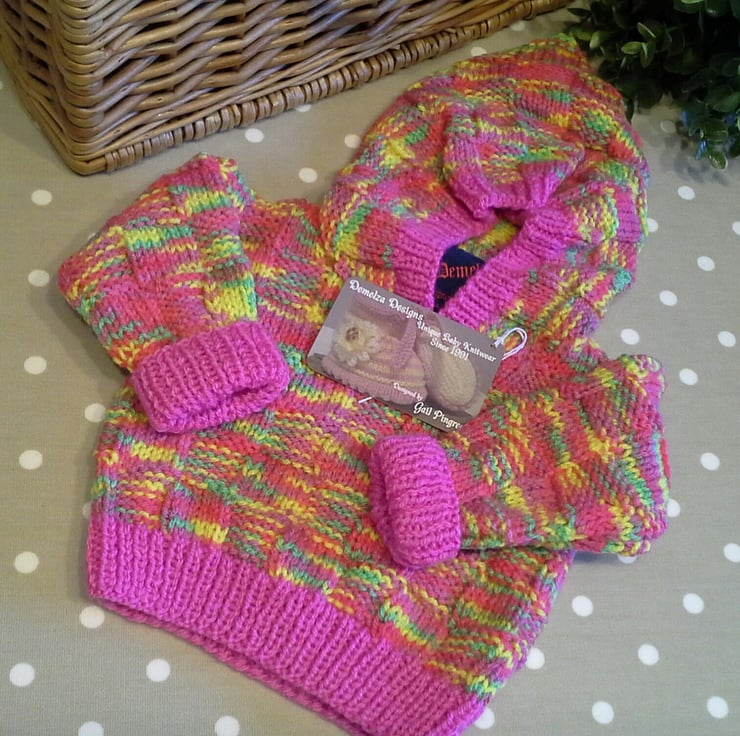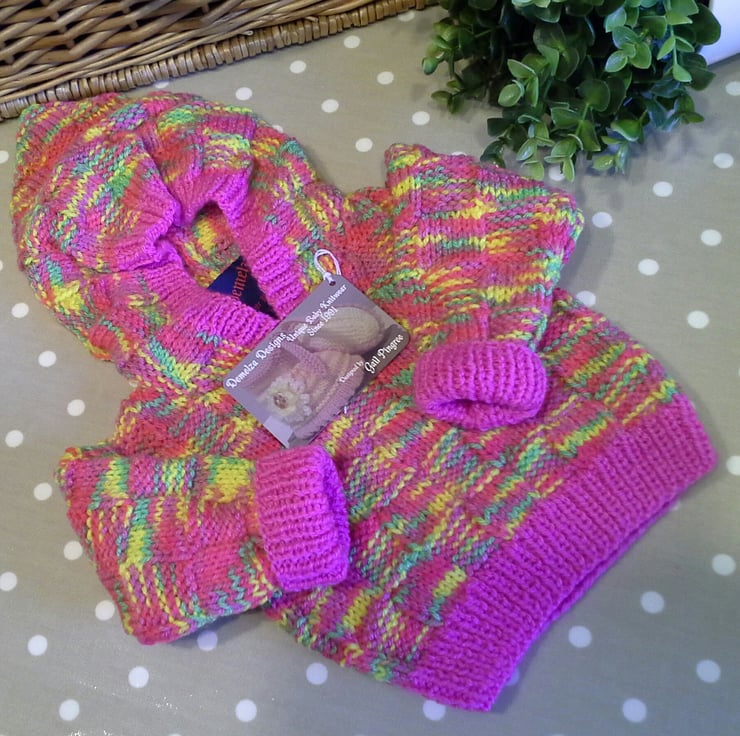 An adorable cosy warm baby girl's colouful hand knitted hooded jumper hand crafted using branded quality British yarns. The jumper has turn up cuffs on the sleeves for extra wear as baby grows. The jumper length is also generous with deep welts and extra length to keep a baby warm around the middle whilst moving around. The garment is machine washable and the care instructions are woven on the reverse side on the 'Demelza' garment label attached to the back neck edge.