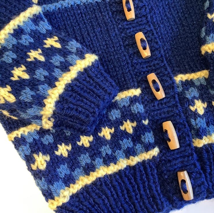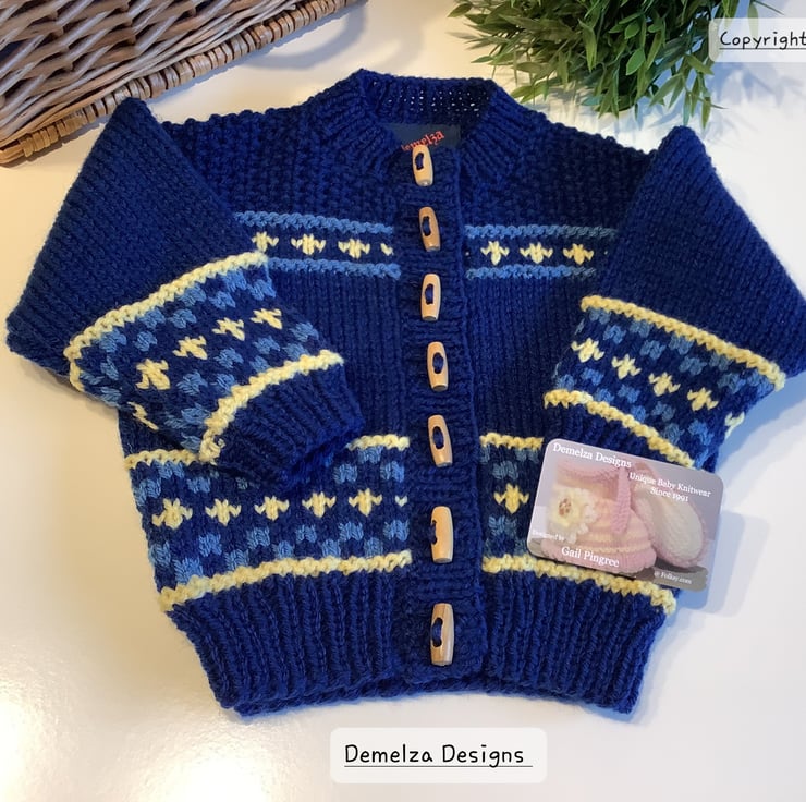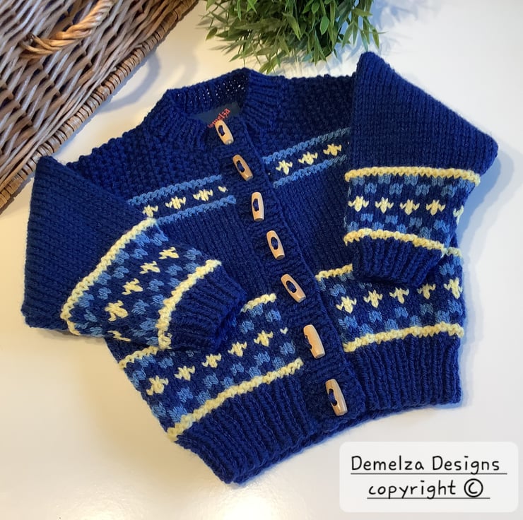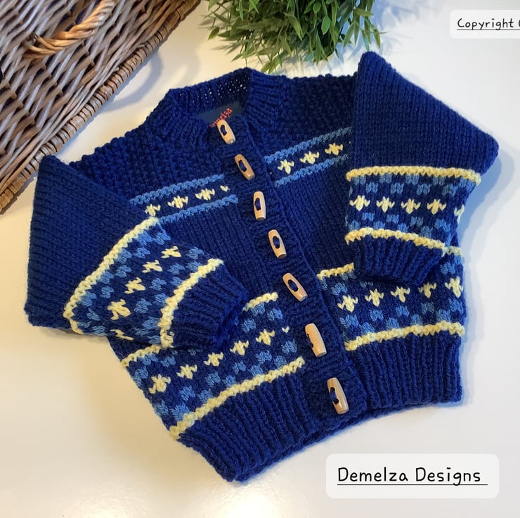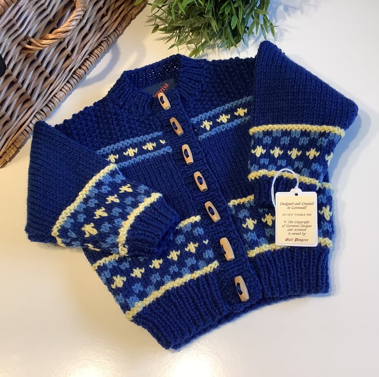 A practicel cosy hand knitted baby boys fairisle cardigan made in Cornwall from quality branded machine washable 20% wool and 80% Acrylic mixed aron weight yarns. The front design is repeated on the back. The wooden toggle buttons have been hand made locally in Cornwall and are very securely attached to the garment for safety. The sleeves are off the shoulder in order for a toddler to move around freely whilst busy playing and running around. It will be an ideal purchase for a little lad to wear during the long winter days and for chilly spring and summer time when a winter coat is not required.