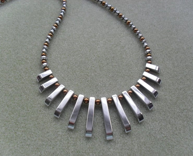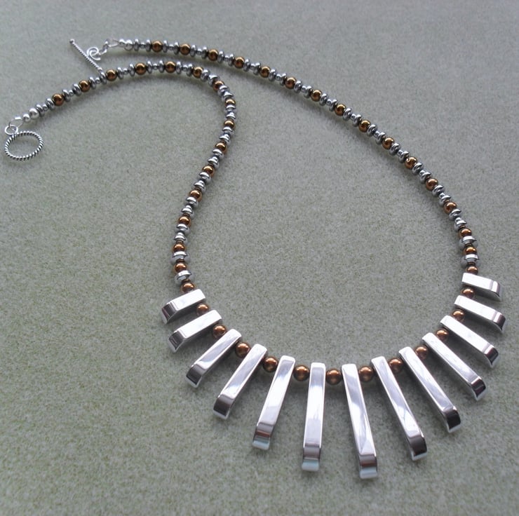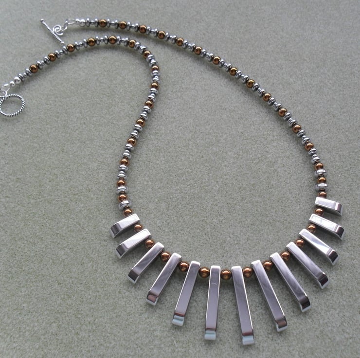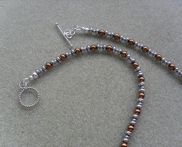 Silver and bronze coated haematite beads which have been attached to a bali silver toggle clasp( which is made of silver) and 4 sterling silver beads and wire protectors.