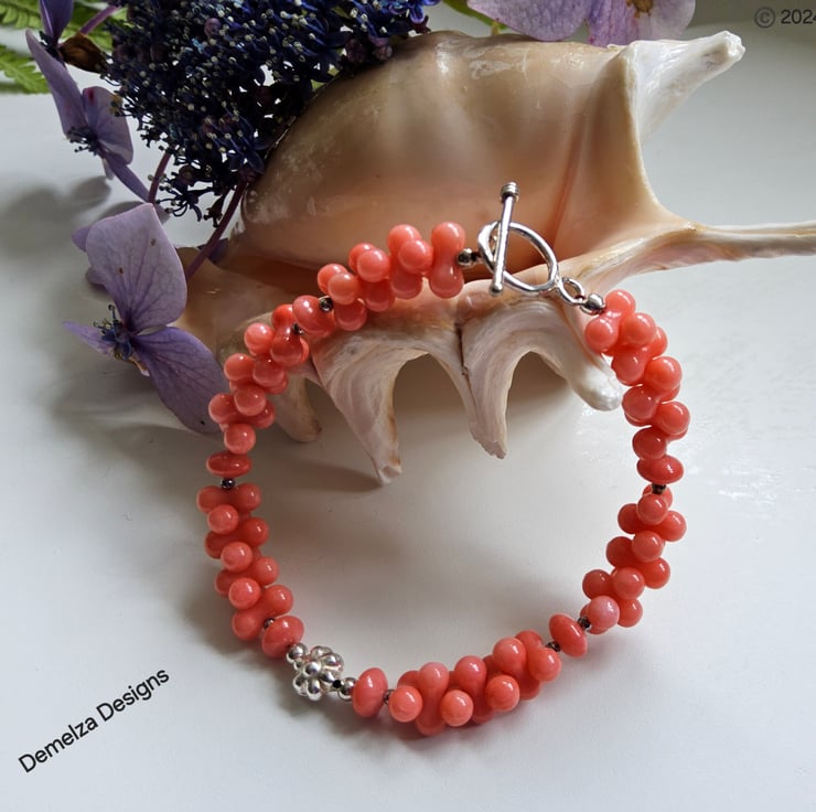 This beautiful luxurious bamboo peach coral bracelet has a 925 sterling silver flower bead at the centre with additional smaller sterling silver beads to either side. Fallowing on saucer cut and peanut cut coral beads complete the bracelet. The bracelet has a heavy weight stamped 925 sterling silver toggle style clasp finishing the design off.