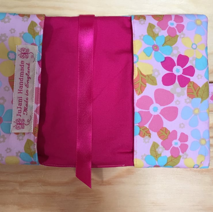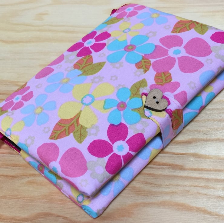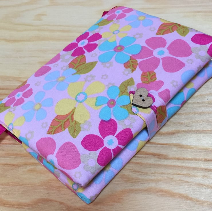 This fabric covered notebook has been made from a brightly coloured ,large flower patterned cotton and lined with a vibrant magenta pink fabric.It has a fabric and wooden heart button closure and a satin ribbon bookmark.A bright pink glitter flower button has been added to the outside cover for decoration.
