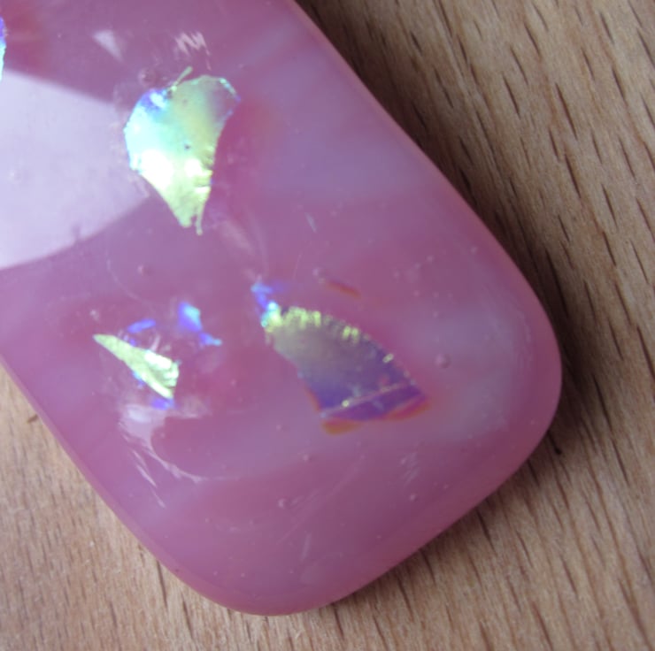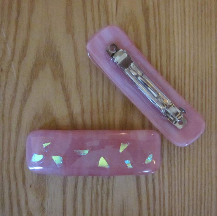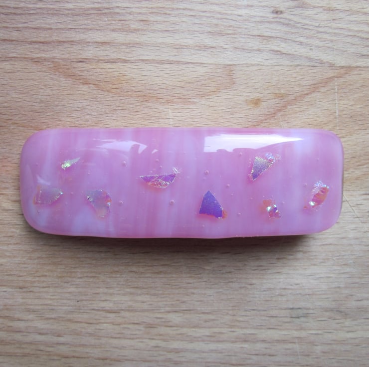 This cabochon has rainbow dichroic frit, on a base of rose pink marbled glass It is fitted with a silver coloured metal barrette clip. It is approximately 10 cms long. This quite a large clip and suitable for someone with thicker or longer hair.