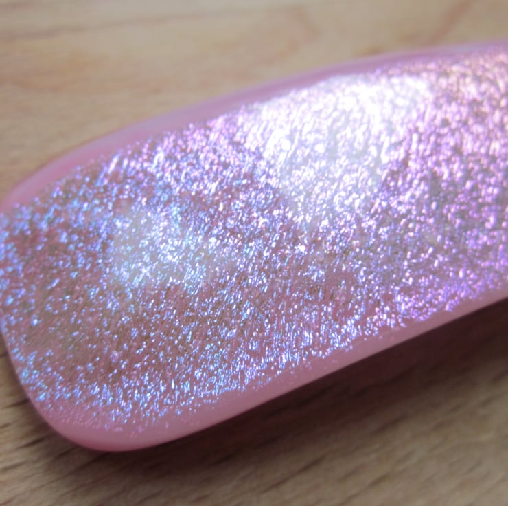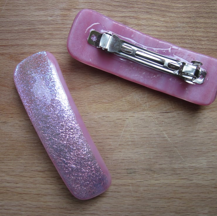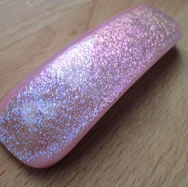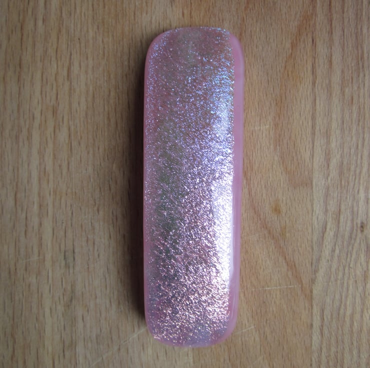 This cabochon has a pink rainbow dichroic shimmer, on a base of rose pink opaque glass It is fitted with a silver coloured metal barrette clip. The photo doesn't do justice to the dichroic shimmer which is a whole rainbow of colours with a pink reflection. t is approximately 10 cms long. This quite a large clip and suitable for someone with thicker or longer hair.