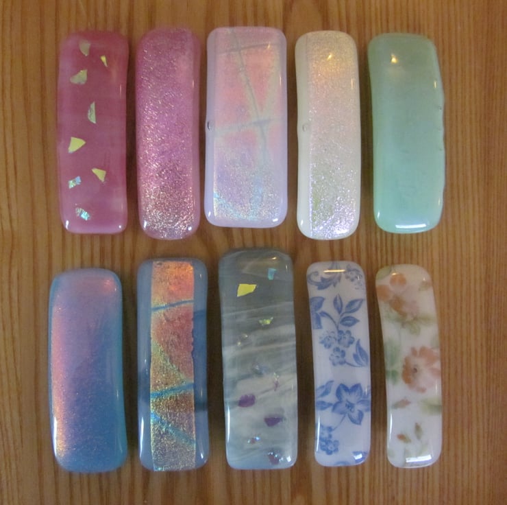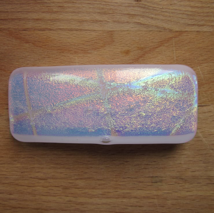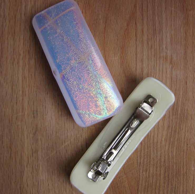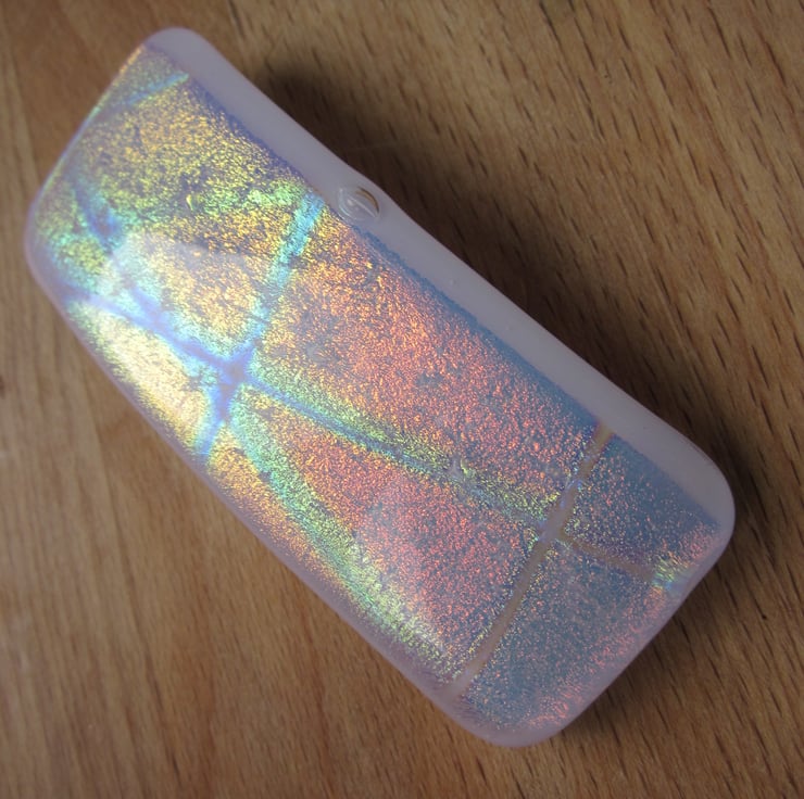 This cabochon has a rainbow tartan dichroic shimmer, on a base of pale pink opaque glass It is fitted with a silver coloured metal barrette clip. The photo doesn't do justice to the dichroic shimmer which is a whole rainbow of colours. It is approximately 10 cms long. This quite a large clip and suitable for someone with thicker or longer hair.