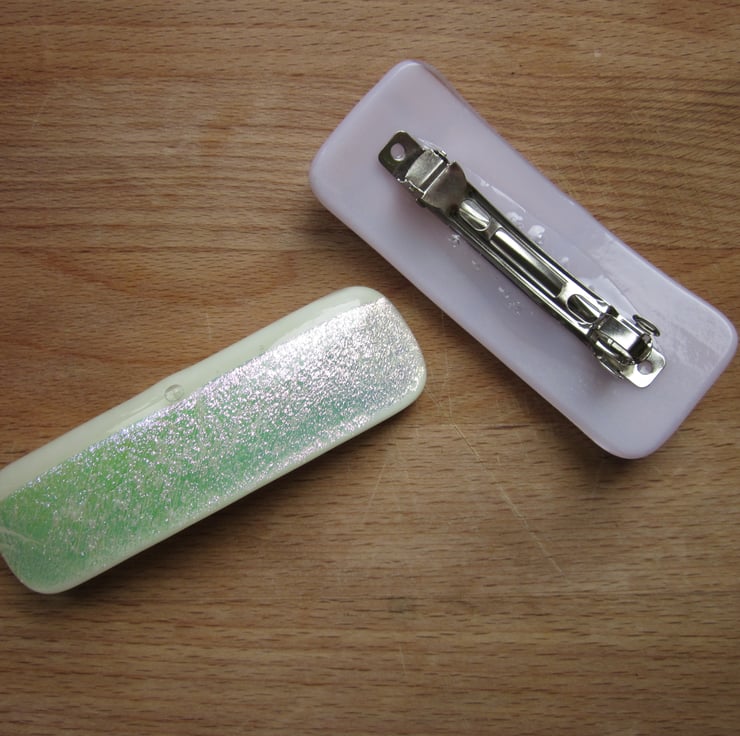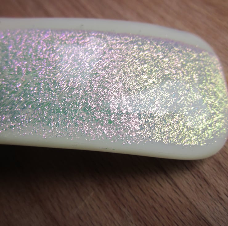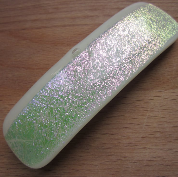 This cabochon has a pink rainbow dichroic shimmer, on a base of vanilla opaque glass. It is fitted with a silver coloured metal barrette clip. The photo doesn't do justice to the dichroic shimmer which is a whole rainbow of colours with a pink reflection. It is approximately 10 cms long. This quite a large clip and suitable for someone with thicker or longer hair.