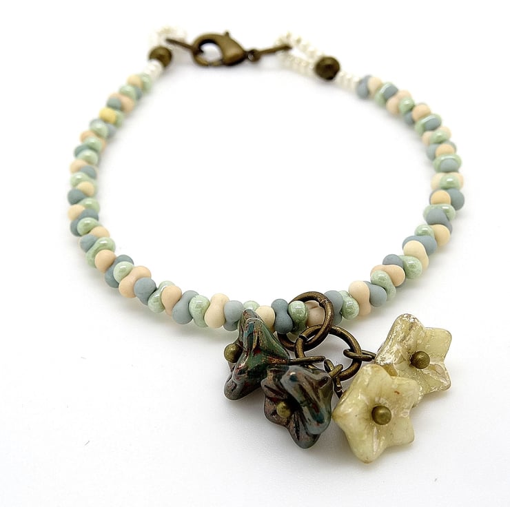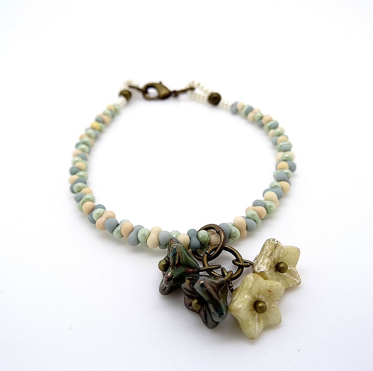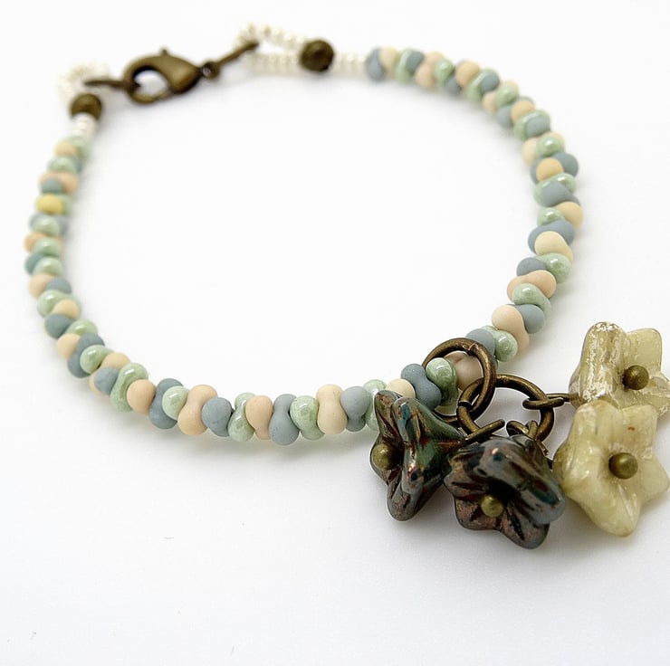 This is a lovely bracelet I have made using czech glass peanut beads and five petal czech glass beads. The colours of the peanut beads are matte stone, matte seafoam and sage green lustre. The colours of the petals are pearl lustre and sage lustre. The bracelet measures just over 7 inches (just over 8cm) and is finished with a antique bronze coloured lobster clasp. As all of the items in my shop are unique, individual pieces made by myself, this is the bracelet you will receive. It will arrive gift wrapped in tissue paper and a organza bag.