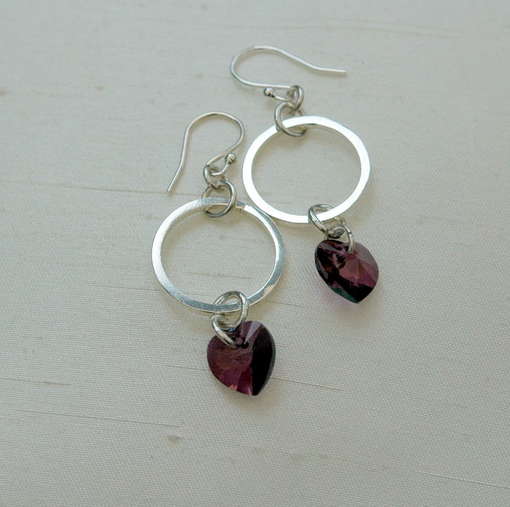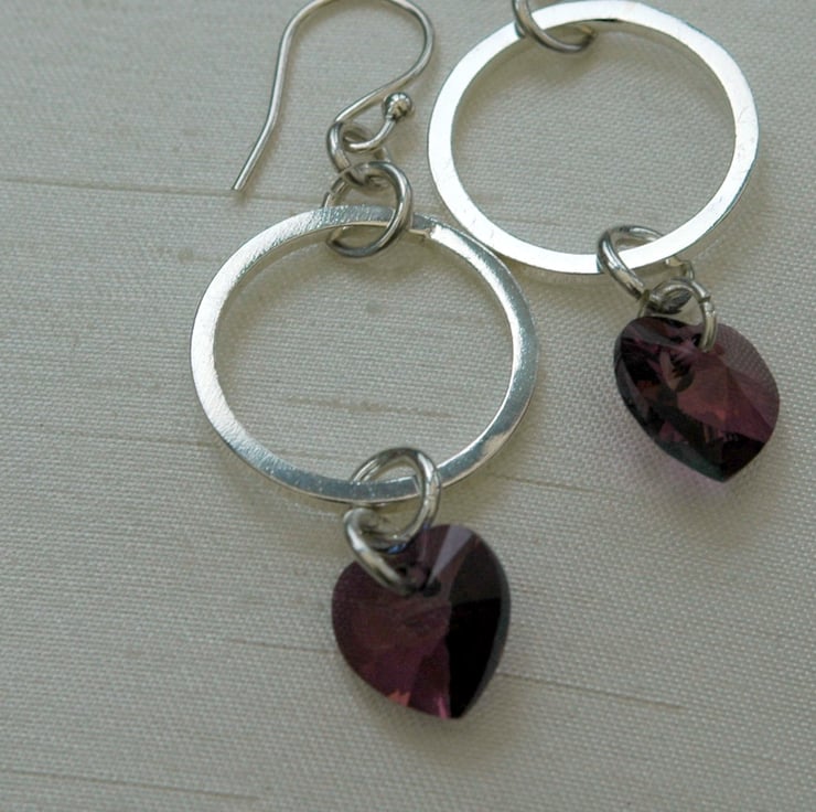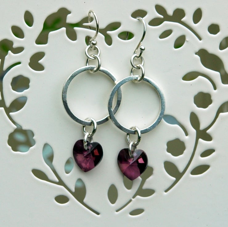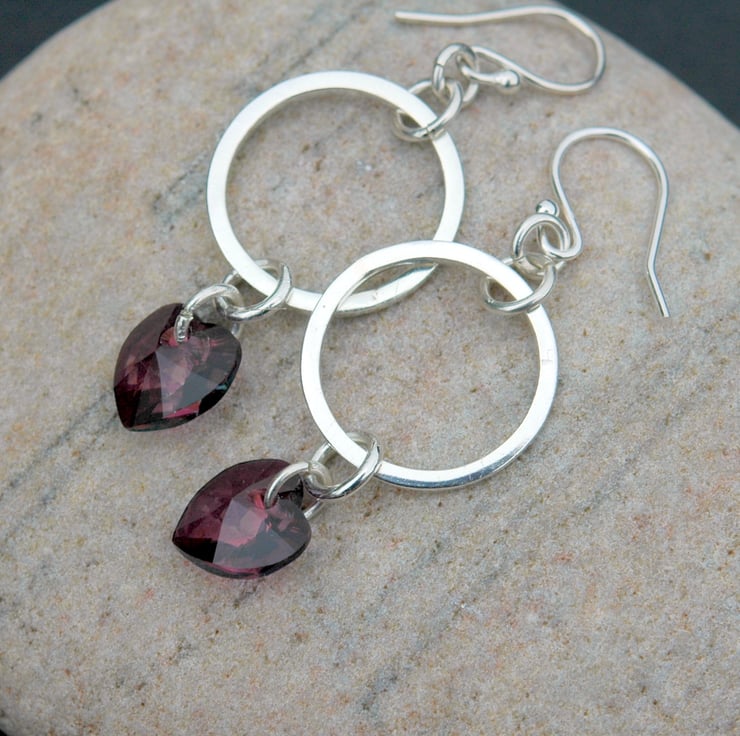 These pretty handmade hoop earrings feature Swarovski® crystal hearts in an amethyst purple colour. The hoops are made from sterling silver square wire and are 1.9cm in diameter. The elegant ear hooks have small silver balls at one end and are stamped '925'. The parts are linked together with sterling silver jump rings, allowing the crystals to dance and sparkle as you move around.
