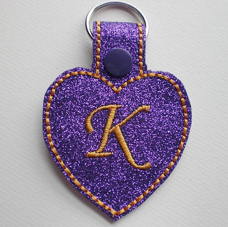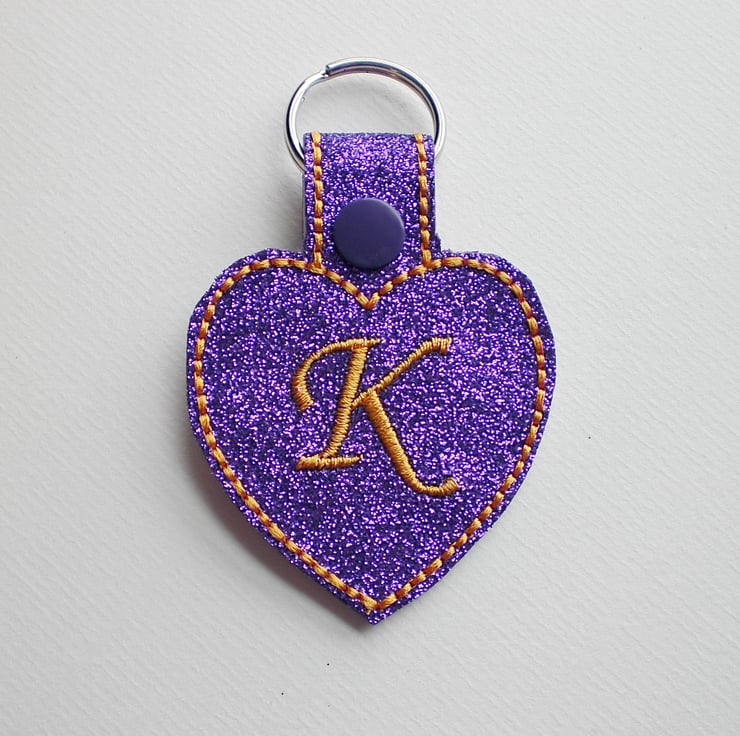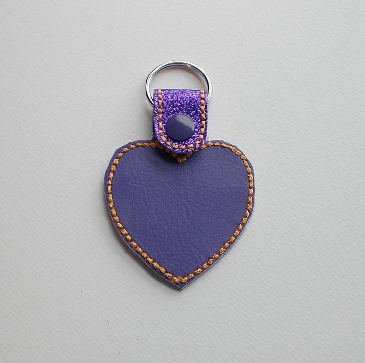 This is a heart key ring made with glitter fabric on the front and a toning leatherette fabric on the back. It fastens to the key ring with a Kam snap so can be removed if required.
