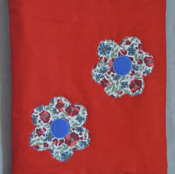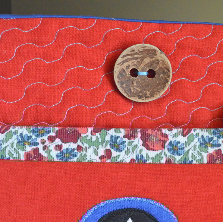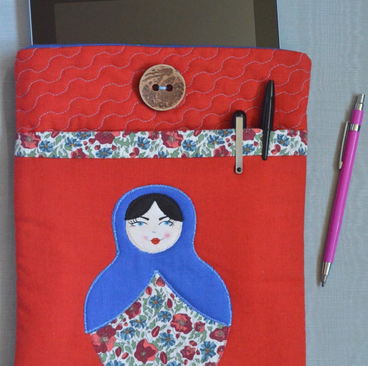 With applique detail on the front and the back, this tablet case is bright and cheeful. The Russian Babushka Doll design has a hand painted face and clothing made up of contrasting fabrics. The flowers on the back of the case carry over the floral motif fabric and I have included some quilt stitching at the top above a very handy pocket.
