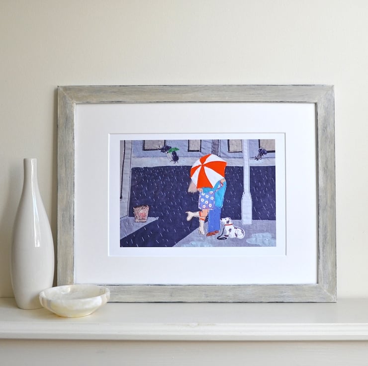 Giclee print reproduction of a textile artwork showing a romantic couple in love, kissing discretely behind a colourful umbrella whilst their dog looks on puzzled, wondering why he is not being paid any attention. The picture shows that love can lift the spirits even on the most dreary rainy day: when all around seems grey and dark, love will inject a blast of colour into your life!