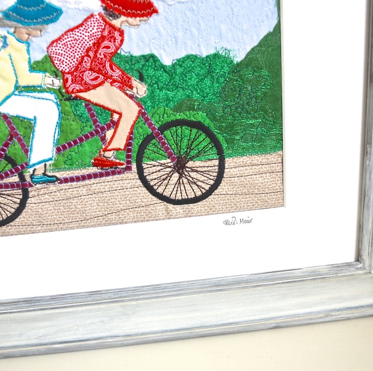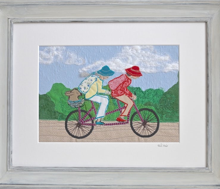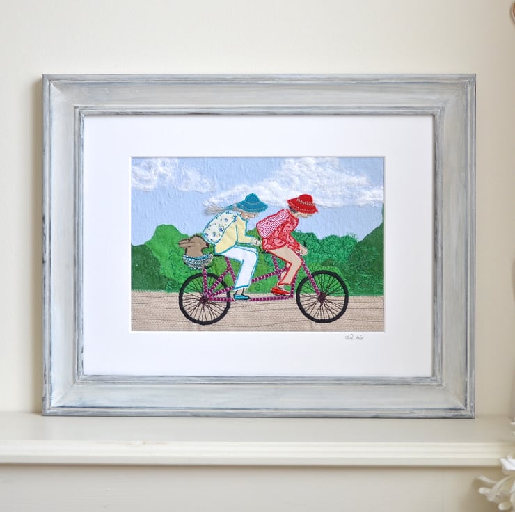 Bicycles and cycling as a sport and pastime have become very popular in recent years. Tandem in the Country shows a couple on a tandem bike, complete with dog enjoying himself in the basket, whizzing along the country lanes.