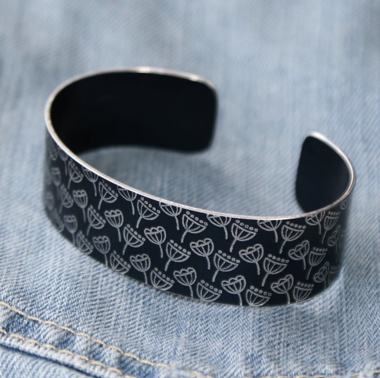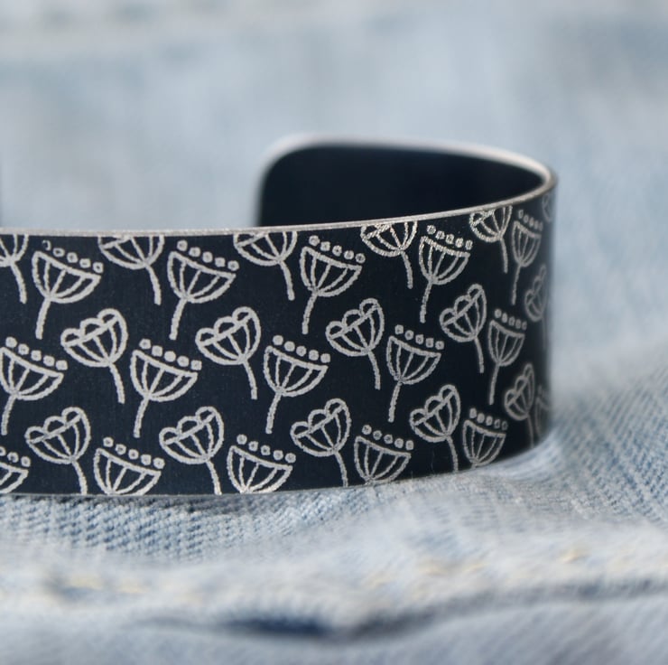A funky narrow cuff made from anodised aluminium with a mini print of seed heads. I drew this pattern digitally, made it into a resist and applied it to the metal. I then dye the aluminium, seal it and remove the resist which leaves the pattern showing in the original colour of the metal. The cuff is then made using traditional metalworking techniques.